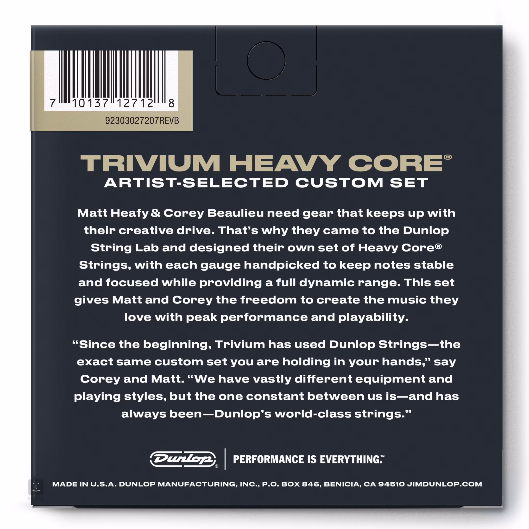 Matt Heafy és Corey Beaulieu a Trivium zenekarból első osztályú húrokat igényelnek a játékukhoz, amelyek tiszta artikulációt és nagy dinamikai tartományt biztosítanak számukra. A Dunlop ezért összefogott velük, és létrehozott egy signature húrkészletet, amelyet professzionális teljesítményre és kemény, heavy metal riffekre terveztek. A húrok a Heavy Core sorozatból származnak, amelyet kifejezetten azoknak a zenészeknek fejlesztettek ki, akik szeretnek alacsonyabb hangolással játszani. Kemény magjuk úgy van kialakítva, hogy alacsonyabb hangolás mellett is tiszta, átható hangot adjon, és precíz hangolási stabilitást biztosítson a legkeményebb high-gain riffeknél is. A húrok nikkelbevonatú acélból vannak tekerve, ami frekvenciailag kiegyensúlyozott hangzást biztosít nekik, tiszta magas hangokkal, átható középtartománnyal és hatalmas basszussal. Ideális választás a hard & heavy stílushoz.