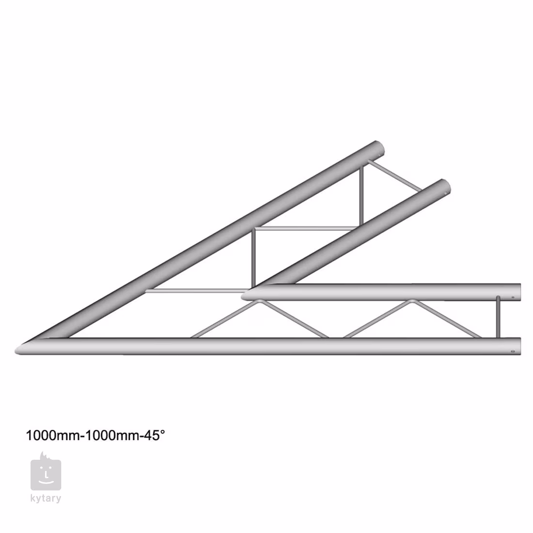 A DuraTruss DT 22-C19H-L45 egy sarokelem egy kétpontos alumínium szerkezethez, amely vízszintesen 45°-os szögben hajlik. Az elem maximálisan stabil és biztonságos mobil színpadok építéséhez szolgál. Az innovatív összekötő rendszernek köszönhetően villámgyors felszerelést és leszerelést biztosít, ideális gyakori használatra. A szerkezet csövei robusztus, 35 mm-es alumíniumból készültek, 2 mm-es falvastagsággal, ami ideális szilárdság-súly arányt garantál. Ennek köszönhetően a rendszer nemcsak ellenálló, hanem könnyen hordozható és kezelhető is. A csomag tartalmazza az összes szükséges összekötő alkatrészt – két kúpot, négy acélcsapot és négy biztonsági kapcsot.