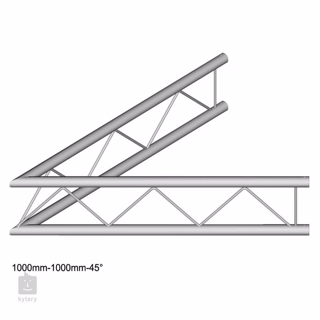 A DuraTruss DT 22-C19V-L45 egy kétpontos alumínium szerkezet sarokelem, amely 45°-os szögben hajlik függőlegesen. Az elem maximálisan stabil és biztonságos mobil színpadok építésére szolgál. Az innovatív összekötő rendszernek köszönhetően villámgyors felszerelést és leszerelést biztosít, ideális gyakori használatra. A szerkezet csövei robusztus, 35 mm-es alumíniumból készültek, 2 mm-es falvastagsággal, ami ideális szilárdság-súly arányt garantál. Ennek köszönhetően a rendszer nemcsak ellenálló, hanem könnyen hordozható és kezelhető is. A csomag tartalmazza az összes szükséges összekötő alkatrészt – két kúpot, négy acélcsapot és négy biztonsági kapcsot.