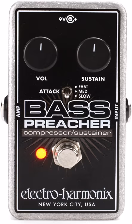 Az EHX Bass Preacher egy kompresszor típusú effekt, amely ellaposítja a basszusgitár játékra jellemző dinamikai ingadozásokat, így a hangzás konkrétabbá válik, és jobban átjön a keverésben. Basszusgitárosok tervezték basszusgitárosoknak.