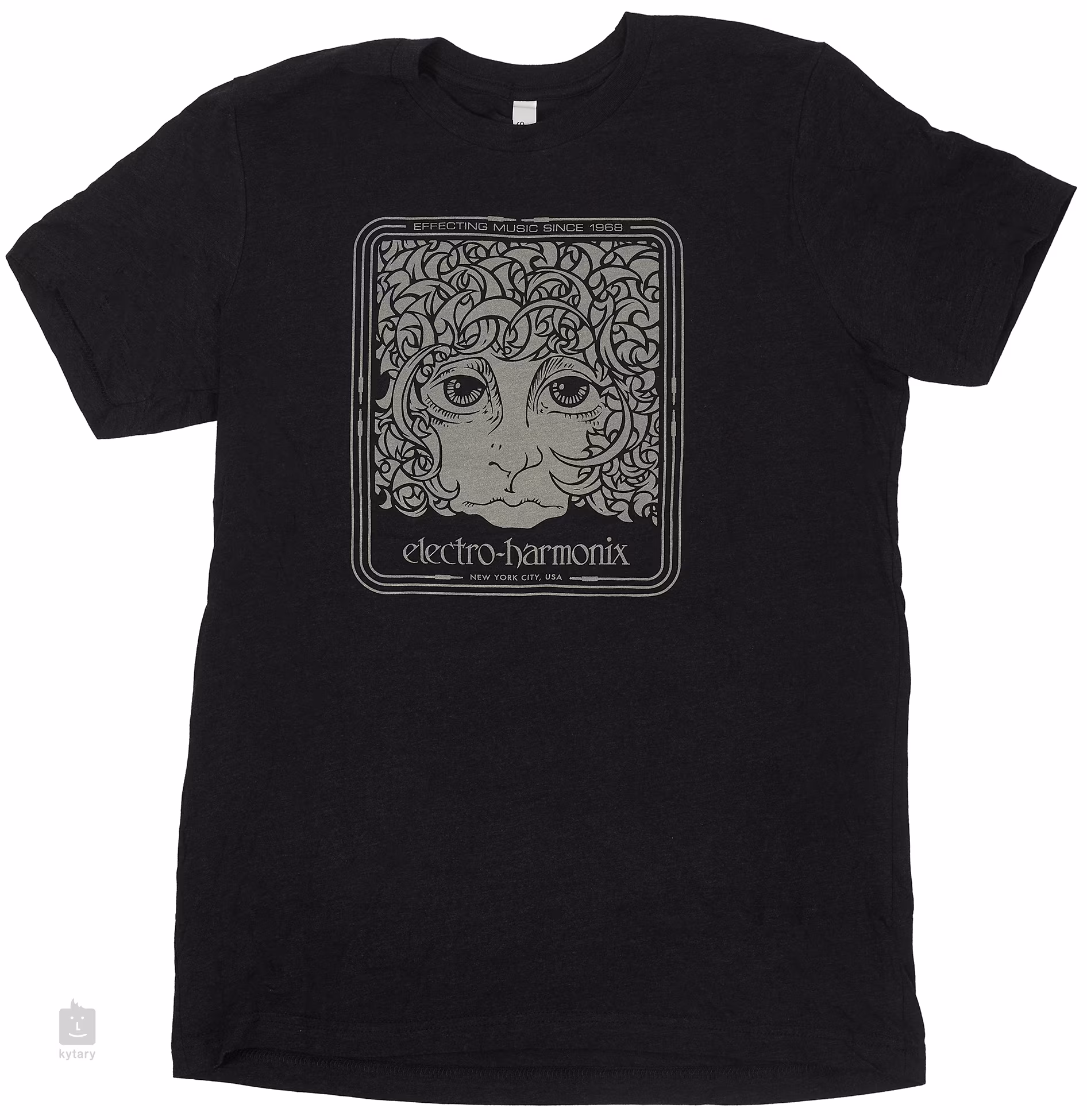 Az Electro Harmonix amerikai effektgyártó cég pólója az 1960-as évek végéről származó eredeti kosfej dizájnnal emlékezik meg a hangzásbeli innováció hosszú útjáról, amelyben az EHX 1968 óta jelentős szerepet játszik. A póló New Yorkban készült, anyagkeverékből (70% gyűrűsfonott, fésült pamut, 15% poliészter, 15% műselyem).