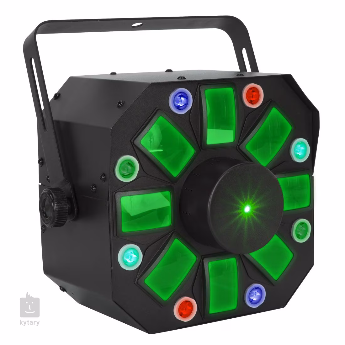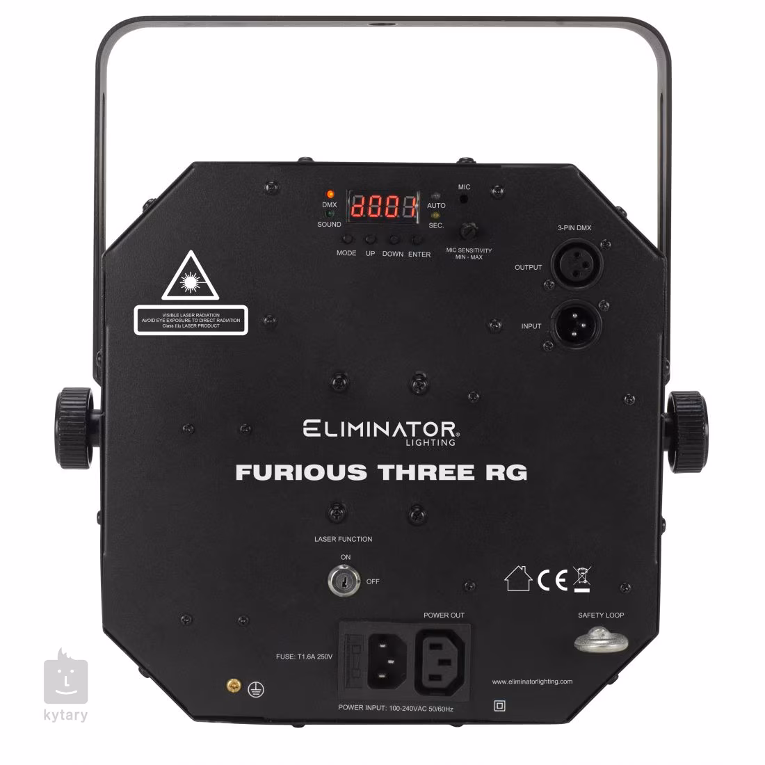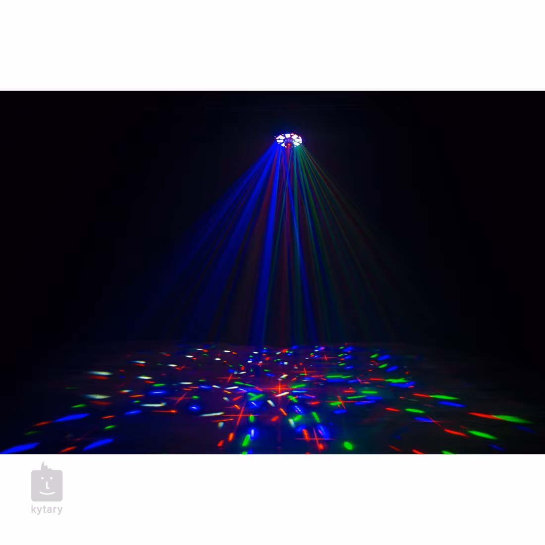 A készülék vezérléséhez használhatja a szabványos DMX-512 protokollt 9 vezérlőcsatornával, az automatikus üzemmódot előre beállított fényshow-k sorával, a hangvezérlési üzemmódot állítható mikrofonérzékenységgel vagy az elsődleges/szekunder üzemmódot, amellyel több egységet szinkronizálhat együtt. A készülék hátlapján ezután egy áttekinthető vezérlőpanel található kijelzővel és gombokkal a manuális beállításokhoz, 3-tűs DMX-csatlakozókkal a zökkenőmentes DMX-jelátvitelhez és IEC tápcsatlakozókkal. A csomagban található egy tartószerkezetre való rögzítéshez szükséges konzol, egy tápkábel és egy biztonsági kulcs a lézerhez.