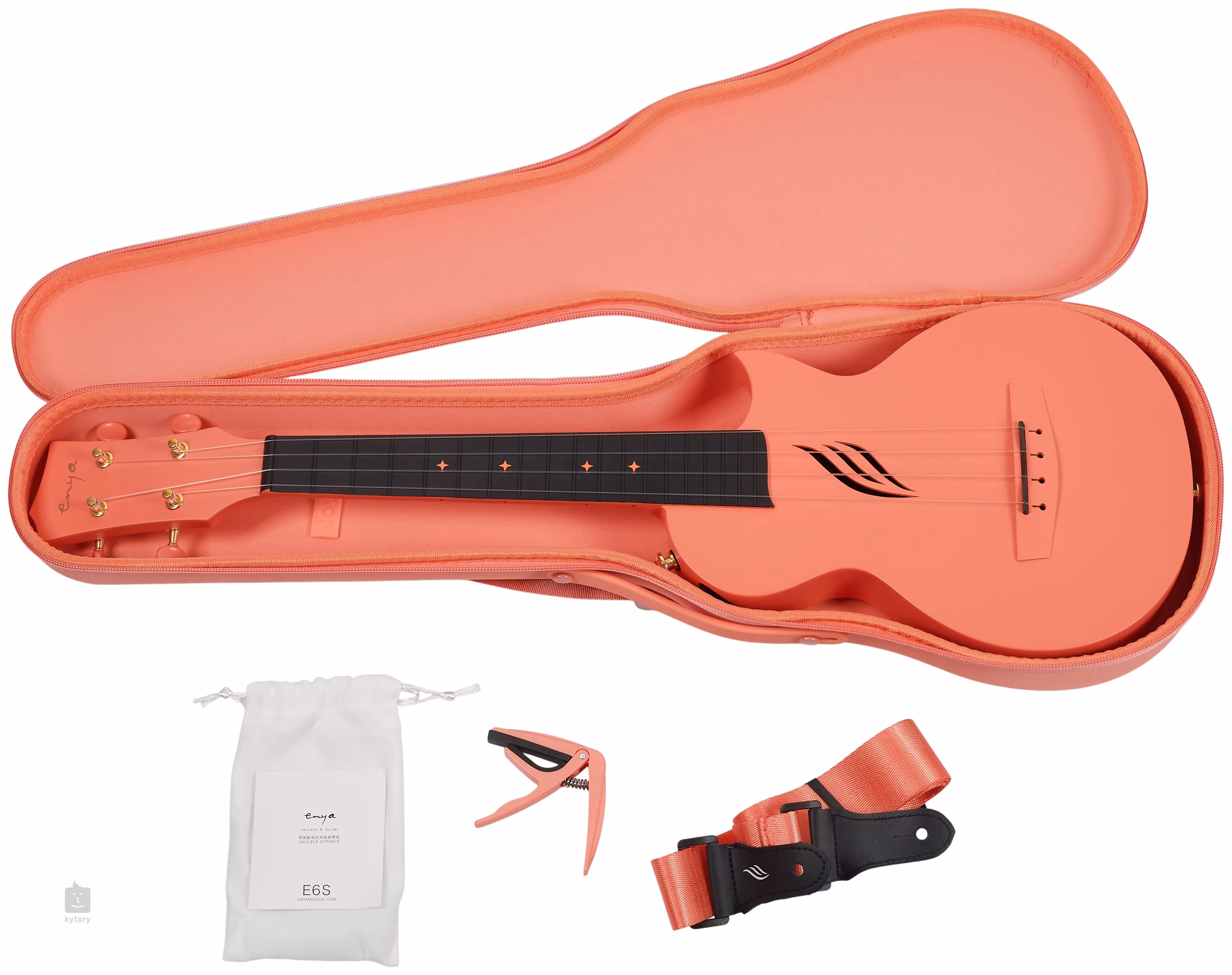 A húrok gitár típusú hangolókulcsokban és kompozit húrtartóban vannak rögzítve. A csomag tartalma: minőségi tok (gig bag), kapodasztr, ukulele heveder és pót húrkészlet.
