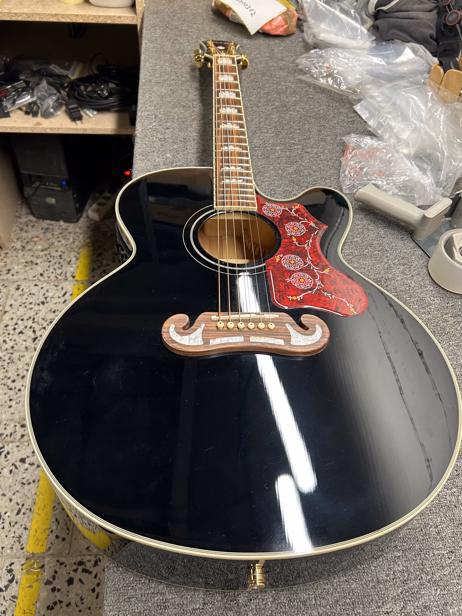 Az Epiphone EJ-200SCE elektroakusztikus gitár a Jumbo Gibson SJ-200 modell tisztelgése és egyben megfizethetőbb alternatívája. Ez egy hatalmas Jumbo/Super Jumbo típusú testtel rendelkező gitár. A gitár elülső fele tömör fenyőből, hátsó fele és oldala rétegelt juharból készült. A 1960-as évek SlimTaper D profilú juharfából készült nyakhoz egy pau ferro fogólap van ragasztva, amelyen húsz Medium Jumbo méretű fekvő van. A fogólap felületén való tájékozódást megkönnyítik a koronák (Crown) alakú, imitált gyöngyházból készült díszes pozíciójelölők. A húrok a Grover Rotomatic hangolóművekben vannak rögzítve, 18:1 áttételi aránnyal, és a pau ferro nyeregben, bajusz alakú (Moustache shape). A szép kivitelezést hagyományos elemek hangsúlyozzák, mint például a test és a fej peremének szegélyezése, a gyöngyház utánzatú pickguard díszes grafikai motívumokkal, amelyeket a Gibson J/SJ-200 modellekből vettek át, valamint az arany színű hardver. A gitár hangzását a Fishman Presys elektronika biztosítja, Sonicore aljzat alatti hangszedővel, Volume, Phase, Contour vezérlőkkel és beépített hangolóval. (Régi jelölés: EJ-200SCE Fishman SoniTone Black)