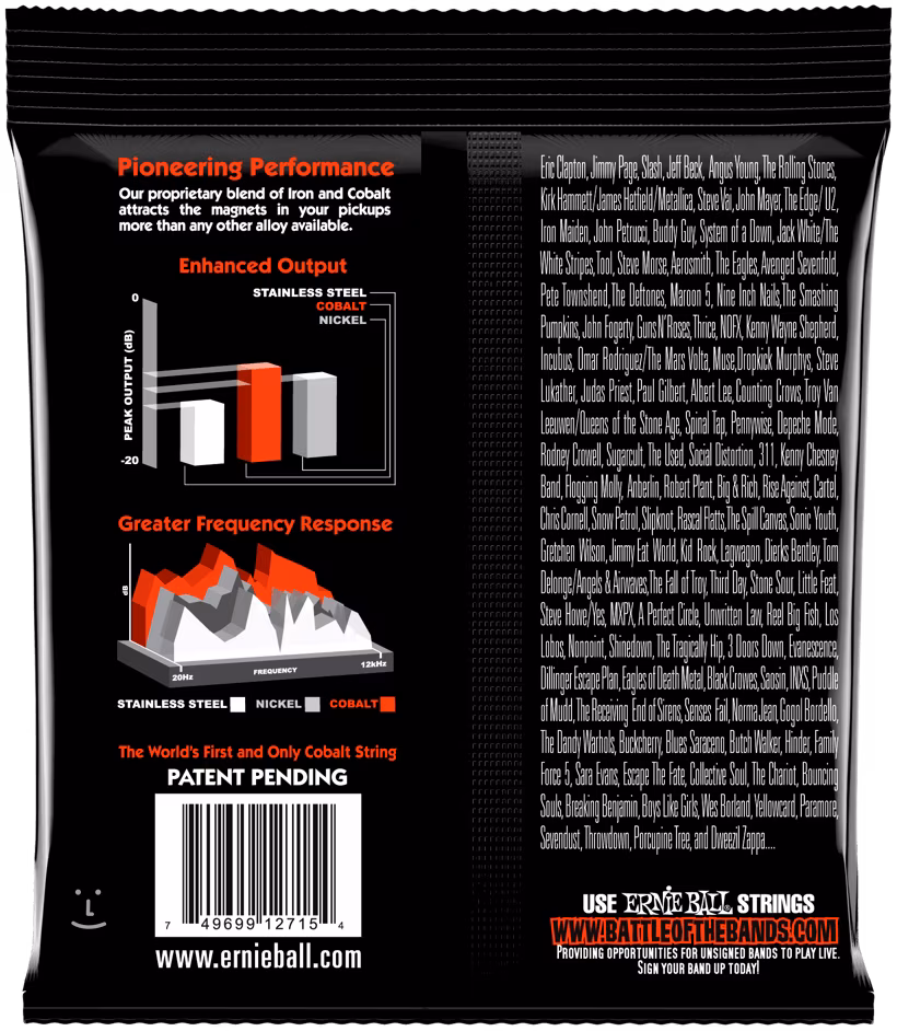 Az Ernie BallCobalt Slinky sorozatú elektromos gitárhúrok úgy lettek kifejlesztve, hogy maximalizálják a hangerejét és tisztaságát, ezért a legmodernebb anyagokat és gyártási technológiákat használják. Jellemzőjük a nagy dinamikatartomány, a magasabb harmonikus hangok nagy száma, az erősebb basszusok és a tiszta, átható magas hangok. Varázsuk a kobalt felhasználásában rejlik, amely jobban együttműködik a hangszedők mágneses terével, és így precíz hangfelvételt biztosít. A kobaltnak köszönhetően a húrok lágyabbak és rugalmasabbak is, amit különösen a hajlításkor értékelni fogsz.