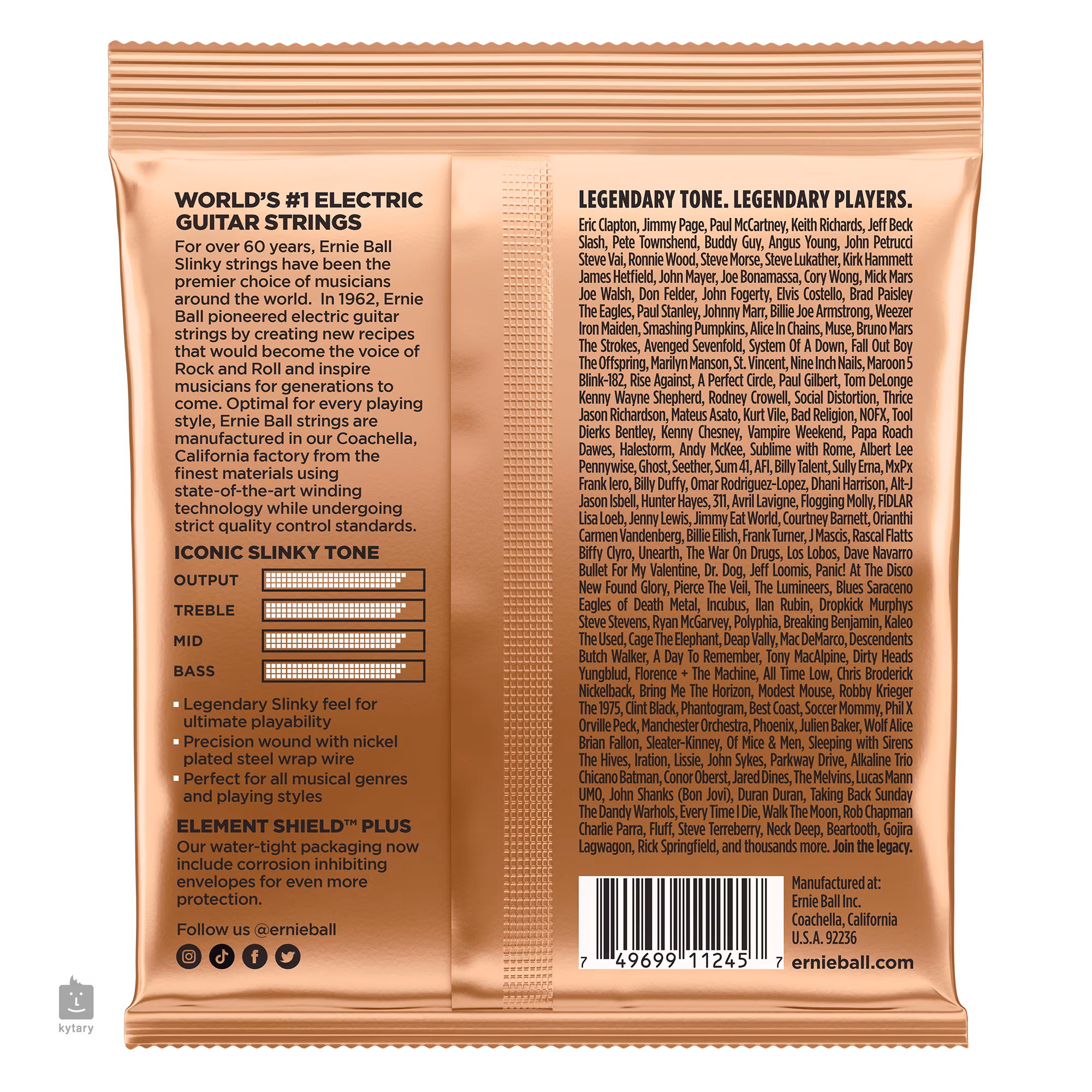 Az Ernie Ball márkájú húrok az elektromos gitár húrok között abszolút bestsellernek és aranystandardnak számítanak. Kiváló minőségű anyagokból készülnek, precíz kivitelezésűek és hangzásuk sokoldalúsága révén szinte minden zenei műfajban alkalmazhatók. Alapjuk egy hatszögletű acélmag és hengeres nikkelbevonatú acéltekercs. Az eredmény egy frekvenciailag kiegyensúlyozott hang, amely rock, metal, pop és blues zenében is jól használható.