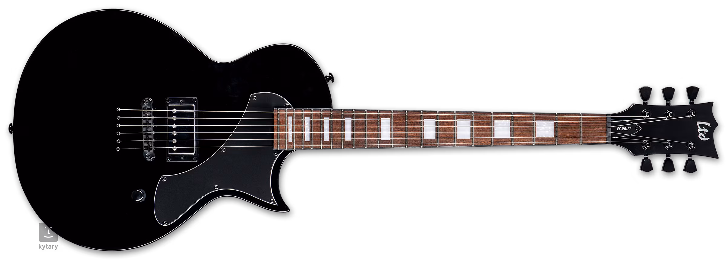 Az EC-201 FT BLACK lapos tetejű mahagóni testéhez háromrészes mahagóni nyak csatlakozik. Huszonkét Extra Jumbo bund osztja meg a pörkölt jatoba fogólapot. A gyöngyházutánzatból készült pozícióblokkok megkönnyítik a fogólapon való tájékozódást.