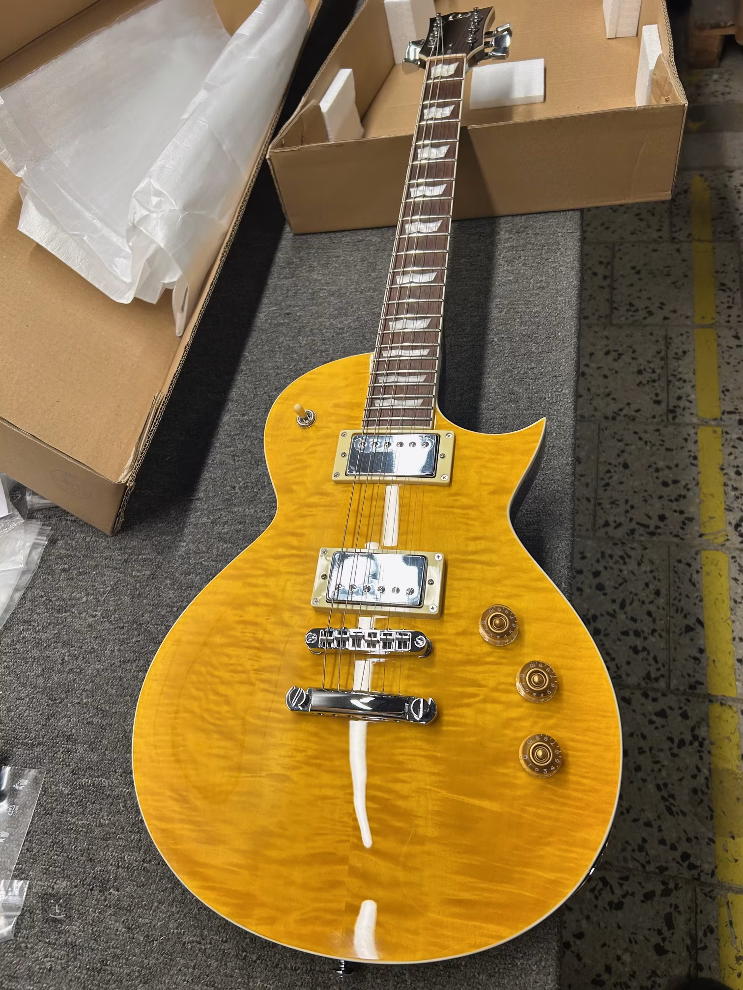 Az LTD EC-201/256 elektromos gitárok rockos single-cut (LP) kialakítással kiváló minőségű hangszerek, amelyek az EC sorozat összes fontos elemét kínálják, és áruk széles körben elérhető, beleértve a fiatal kezdő gitárosokat is. Az EC-256 LD gitár mahagóni testét látványos, réteges juharfurnér és Lemon Drop színű bevonat díszíti. A három darabból álló, „Thin U” profilú keskeny mahagóni nyakhoz hőkezelt jatoba fa (roasted jatoba) fogólap van ragasztva, amelyen 22 Extra Jumbo méretű bund található. A fogólapon való orientációt imitált gyöngyházból készült pozíciós blokkok segítik. A két gyári passzív humbucker agresszív hangzást biztosít a gitárnak, amely alkalmas a mai rock- és metalzenékhez, de tiszta single-coil érzést is nyújt (a humbucker tekercsek szétválasztásának lehetőségének köszönhetően). A húrok a gyártó hangolóműveiben vannak rögzítve, és a TOM húrtartón keresztül a húrtartóban. A szép kivitelezést a test, a fogólap és a fej világos szegélye hangsúlyozza. Az ESP cég 1984 óta foglalkozik elektromos gitárok gyártásával, és elégedett vásárlói között olyan nevek találhatók, mint Kirk Hammett, James Hetfield, Ronnie Wood vagy Max Cavalera. Ezen hangszerek népszerűségének köszönhetően létrejött az LTD leányvállalat is, amely a népszerű modelleket megfizethetőbb kivitelben kínálja.