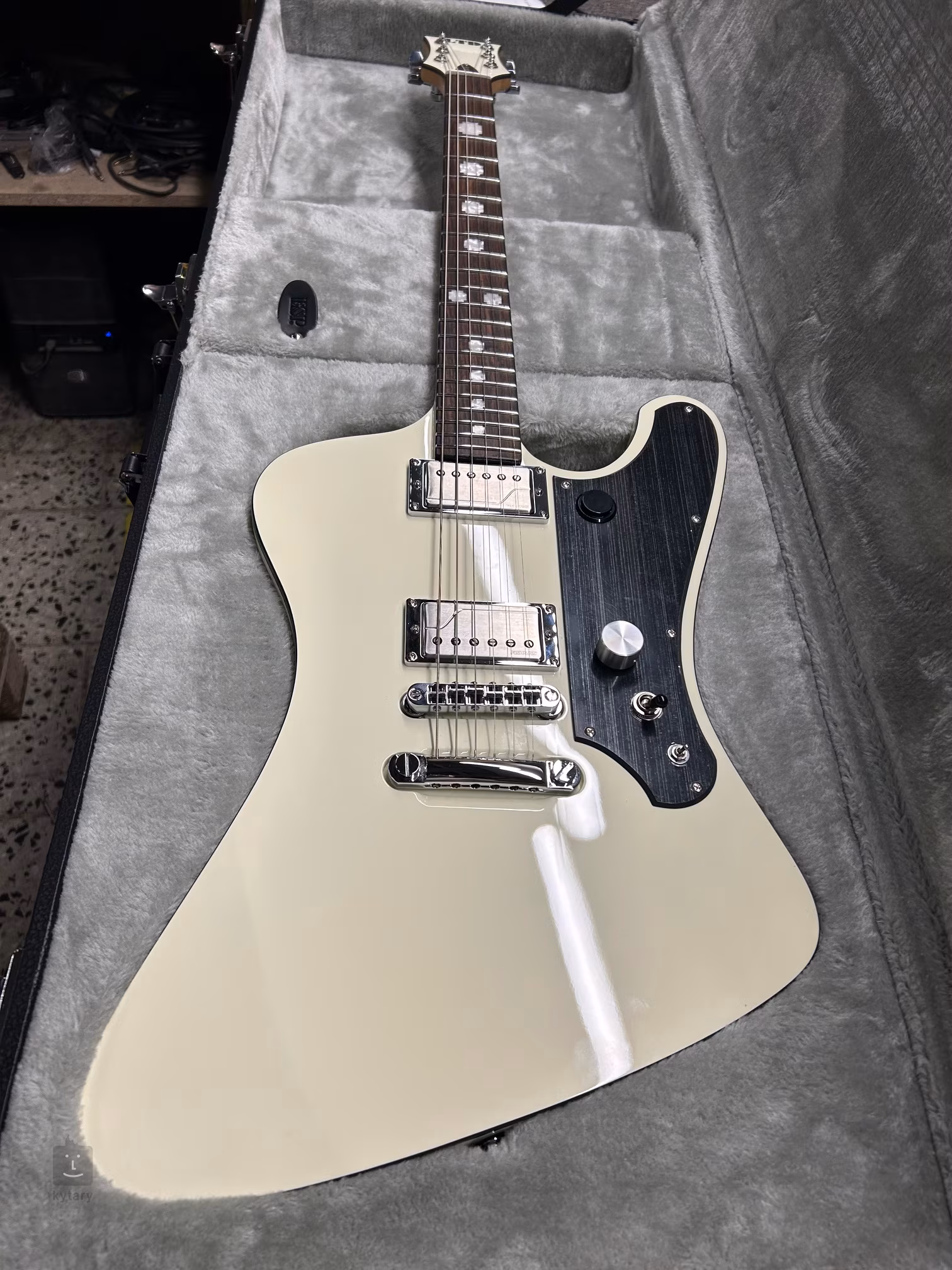 Elektromos gitár ESP LTD Richard ZK RZK-III Olympic White a gitáros Richard Z aláírása modell. Kruspe, a német Rammstein együttes gitárosa. A hangszer az eltolt ESP Phoenix dizájnján alapul, amelyet Richard ZK az Emigrate videó forgatása során ismert meg, és annyira megtetszett neki, hogy az ESP embereivel úgy döntöttek, hogy elkészítik a signature modellt.