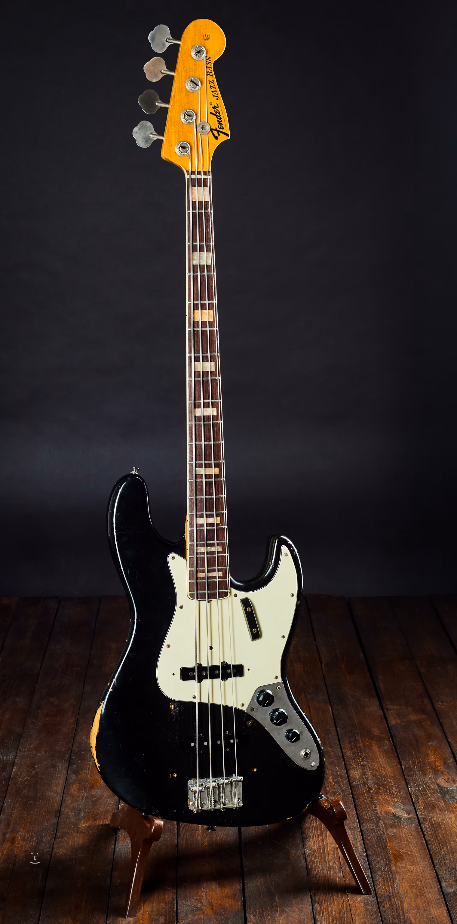 Fender Jazz Bass 1971-ből, a ritkábban használt fekete színben. Mit mondhatnék? - Ez egy igazi példája egy basszusnak, ahogyan annak kinéznie és hangzania kell. Ez a gyűjtői hangszer gazdag életet élt, mégis tökéletes játszható állapotban van, csak fogd meg és játssz.