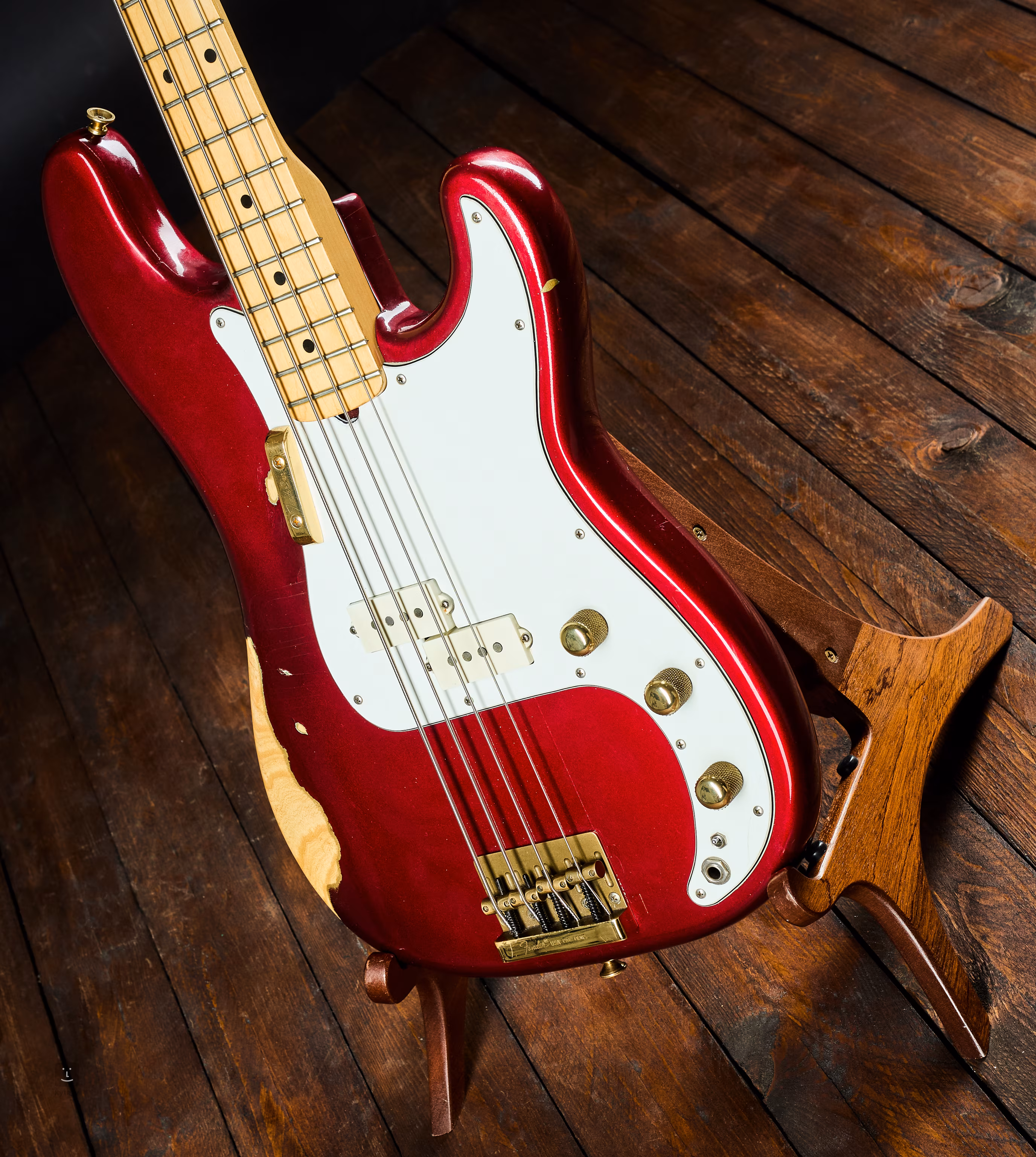 A kőris test Candy Apple Red színben lakkozott, a juhar nyak szintén "matching headstock" színű.