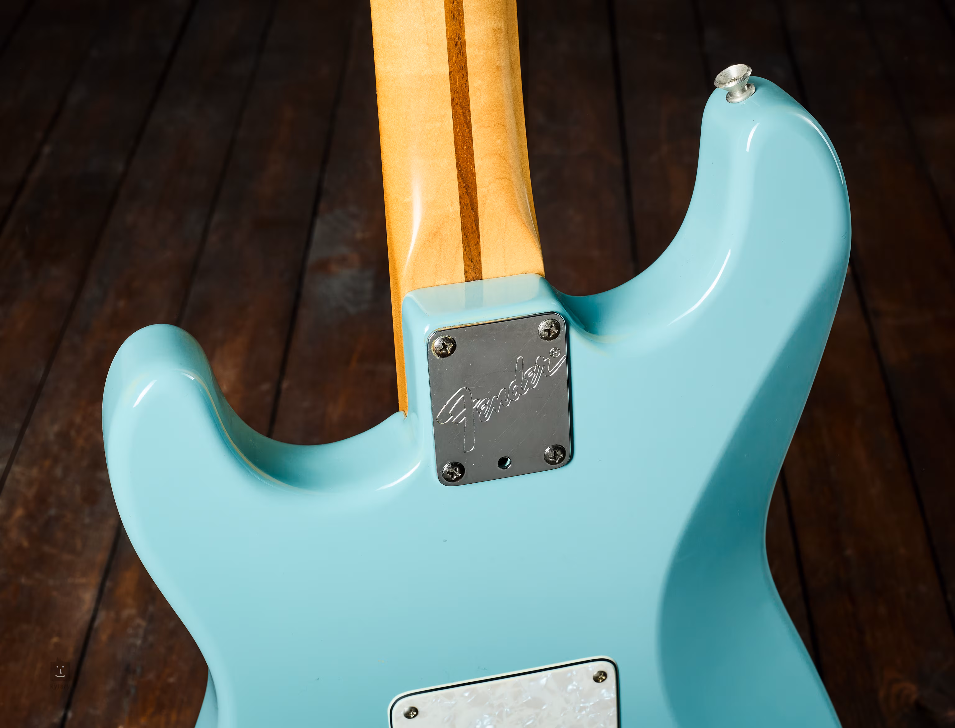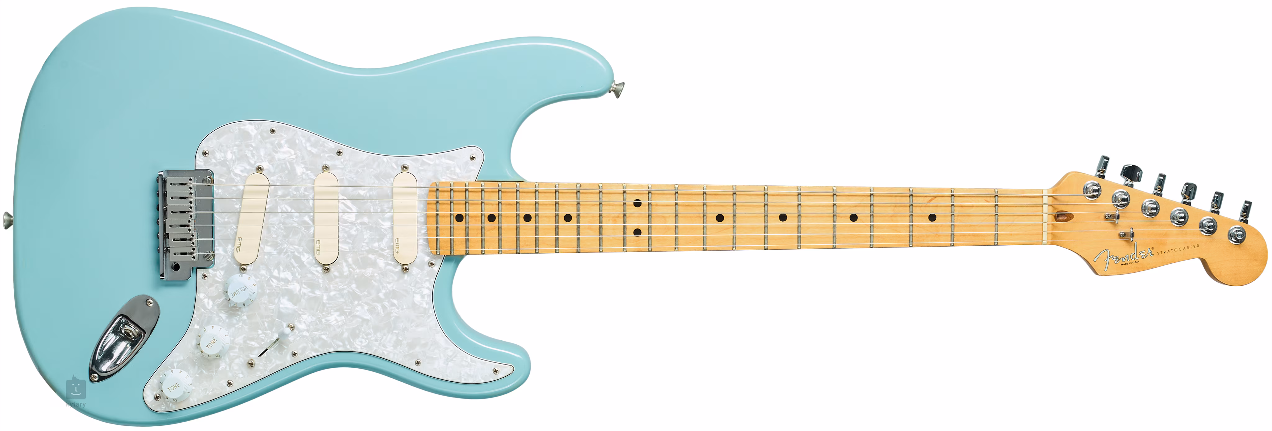 Amerikai Stratocaster, gyártási év: 1996 körül, kicserélt elektronikával, EMG DG20 (David Gilmour) zúgásmentes pickguard szettel és hozzáadott Fender zárható mechanikákkal.