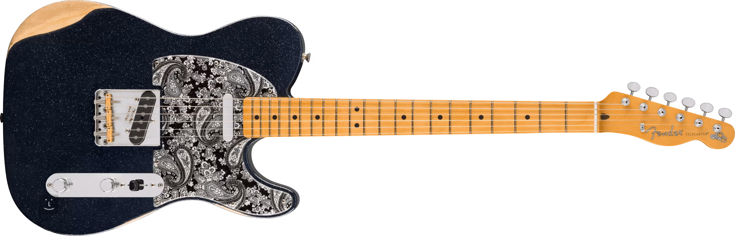 Két egytekercses hangszedő, egy egyedi tekercselésű ´64 Tele fejpánt és egy Twisted Tele nyak, klasszikus hangzást ad a gitárnak, a melegség és a Tele twang megfelelő egyensúlyával. Állítsa be a hangzás kontúrjait a standard vezérlőkkel. A húrokat a cég vintage stílusú mechanikáiba és a testet áthúzó, három sárgaréz nyereggel ellátott Tele-hídon keresztül szerelik fel. A stílusos kivitelezést a lakk és a hardverek finom faux patinája, a fekete és ezüst színű "paisley" motívumokkal díszített egyedi átlátszó koptató, valamint a fejlécen található cowboykalap-jelzés emeli ki.
