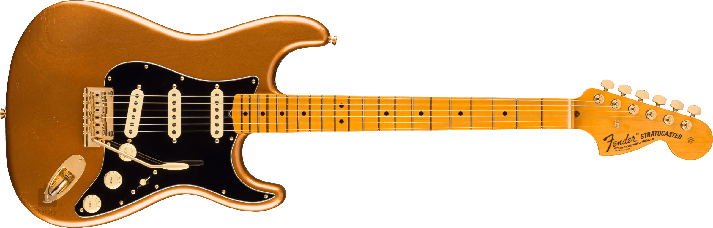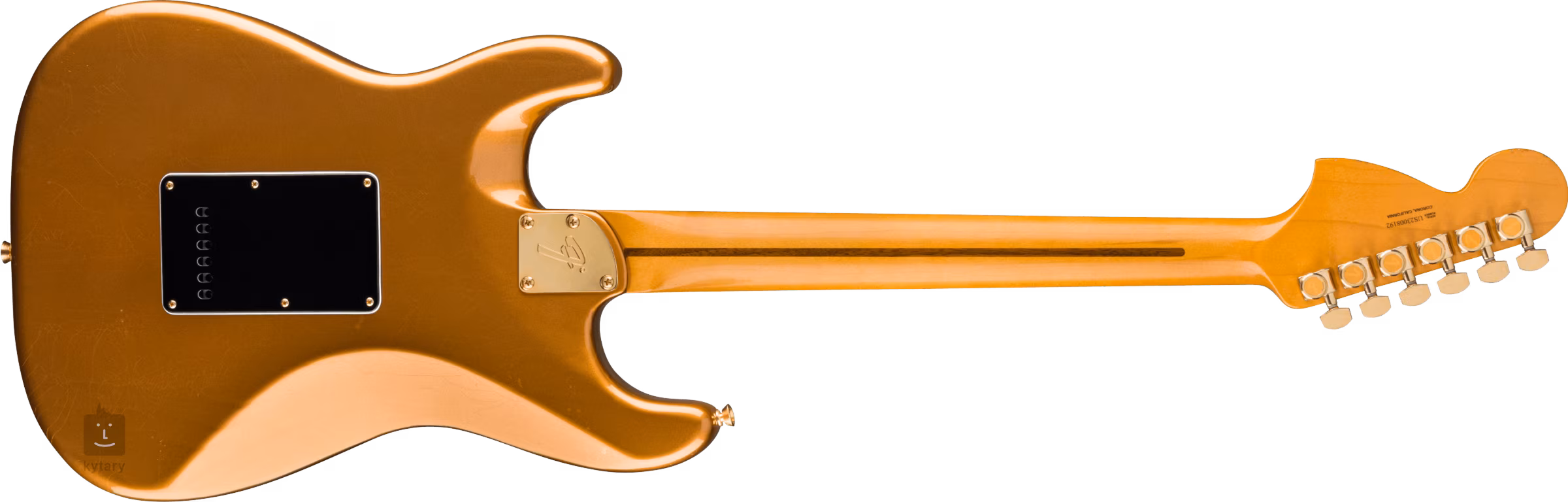A húrokat reteszelő hangolómechanizmusok (Deluxe Cast/Sealed Locking) és egy modern szinkronizált tremoló tartja, acél nyergekkel, acél tremolóblokkal és kétpontos rögzítéssel. A stílusos kivitelezést a Heirloom Aged Gold hardverek emelik ki.