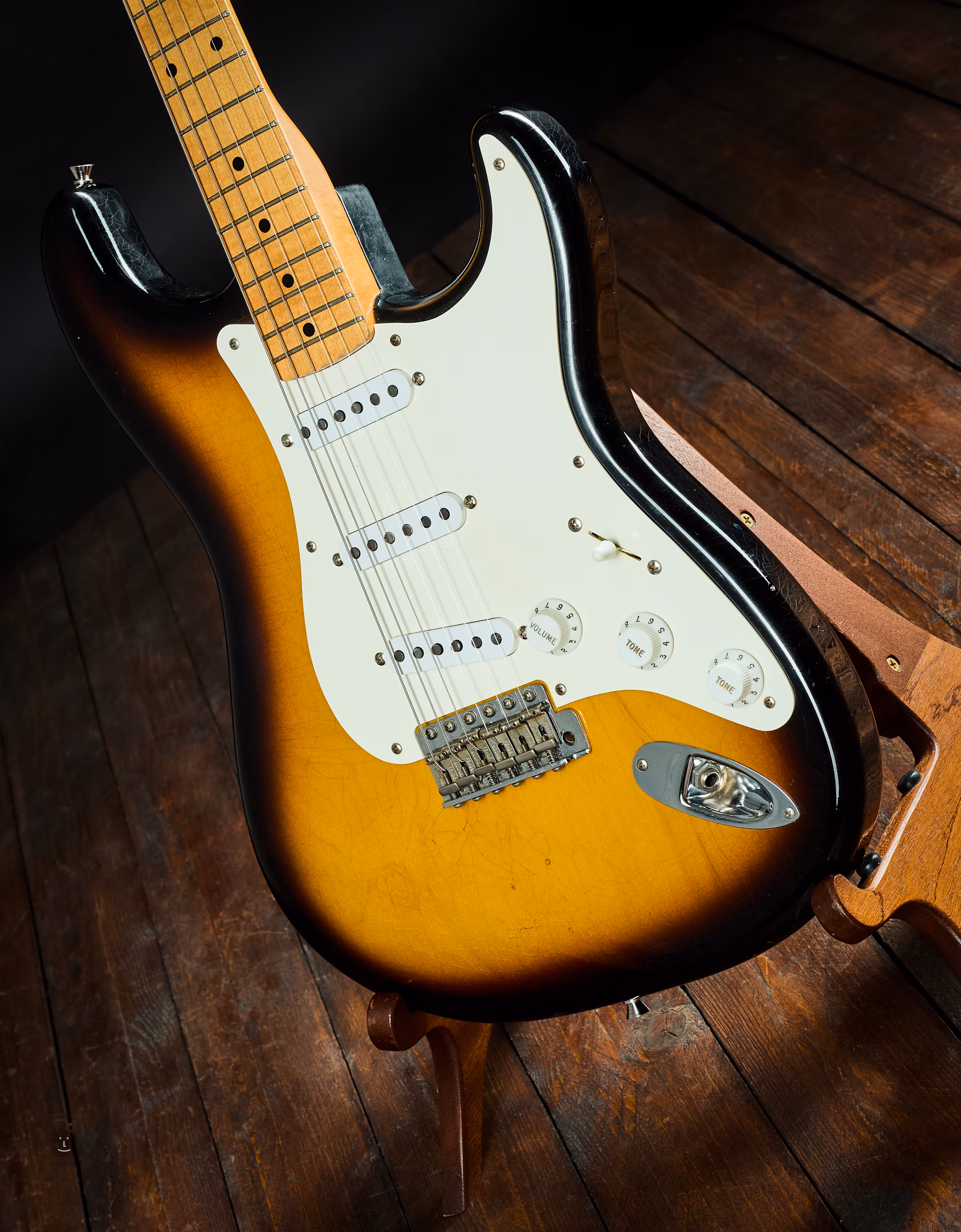 A gitáron van néhány apró koppanás (beütött darabok a Closet Classic lakkból, amelyek elszíneződtek). Egyébként a hangszer tökéletes állapotban van. A gitárra sokáig más márkájú hangszedőket szereltek, az utolsó tulajdonos eredeti Fender Custom Shop Fat 50-esekre cserélte őket - tehát eredeti, csak újak.