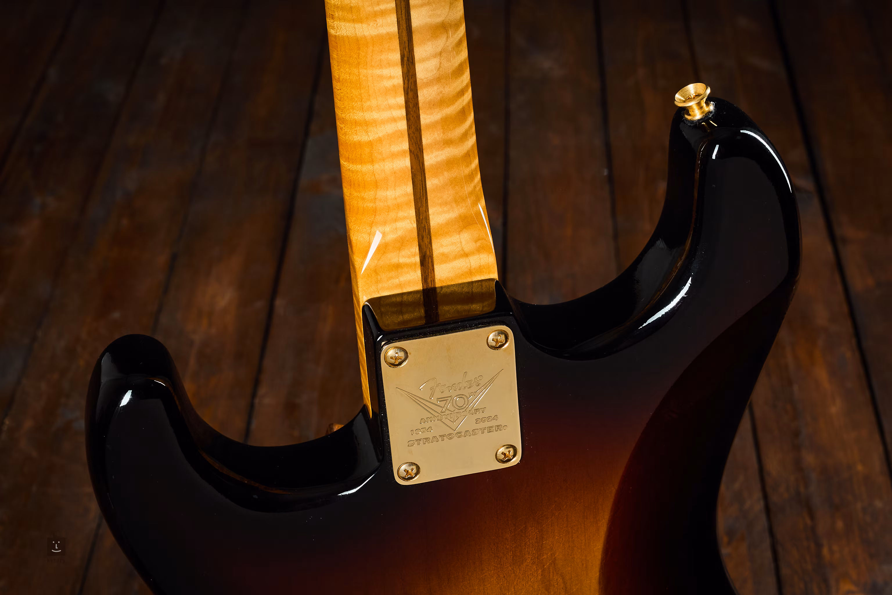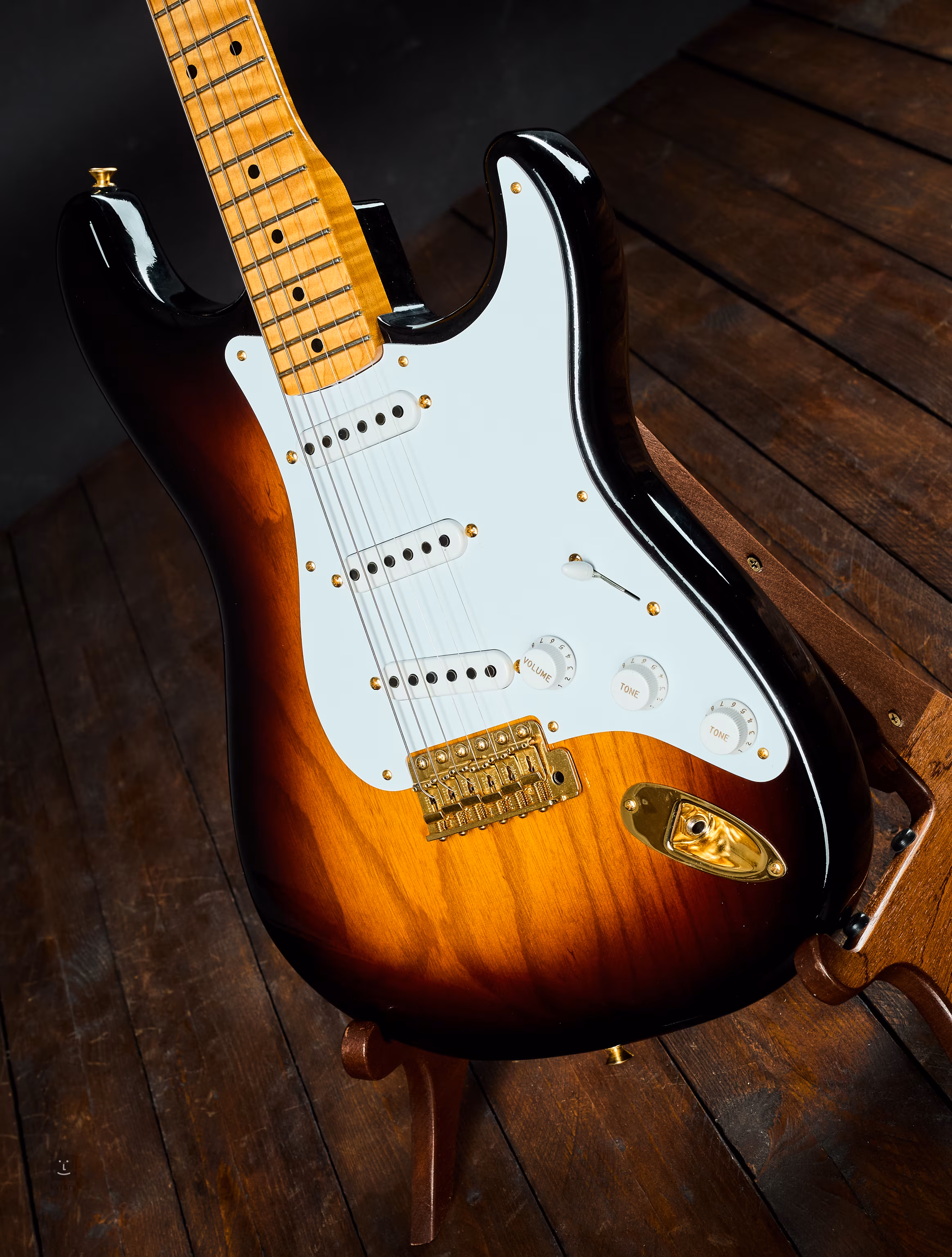 A kétrészes kőris test Wide Fade Two-Color Sunburst lakkozást kapott. A Deluxe Closet Classic finiš finom, mesterséges patinát ad: diszkrét oxidáció a fémeken, apró felületi karcok a testen és a fejen, enyhén fakó műanyag elemek és összességében visszafogott fény – mintha évtizedeken át csak ritkán vették volna elő a tokból. Az egyrészes, 5A minőségű flamed juhar nyak speciális 70th Anniversary Soft „V” profillal készül, az 1954 júliusi Strat specifikációi alapján. A fogólapon 21 Medium Vintage bund (47095) található. Három, Custom Shopban kézzel tekercselt single coil adja a klasszikus Strat hangot tiszta, csilingelő magasakkal. A hangszín standard kezelőszervekkel formálható. Vintage stílusú kulcsok és Custom Shop szinkron tremoló gondoskodnak a korhű érzetért. A részletek: egyrétegű fehér pickguard, sorozatszám a hátlapon, 1954 stílusú ABS pickup- és potisapkák, valamint a 70th Anniversary Stratocaster nyaklap.