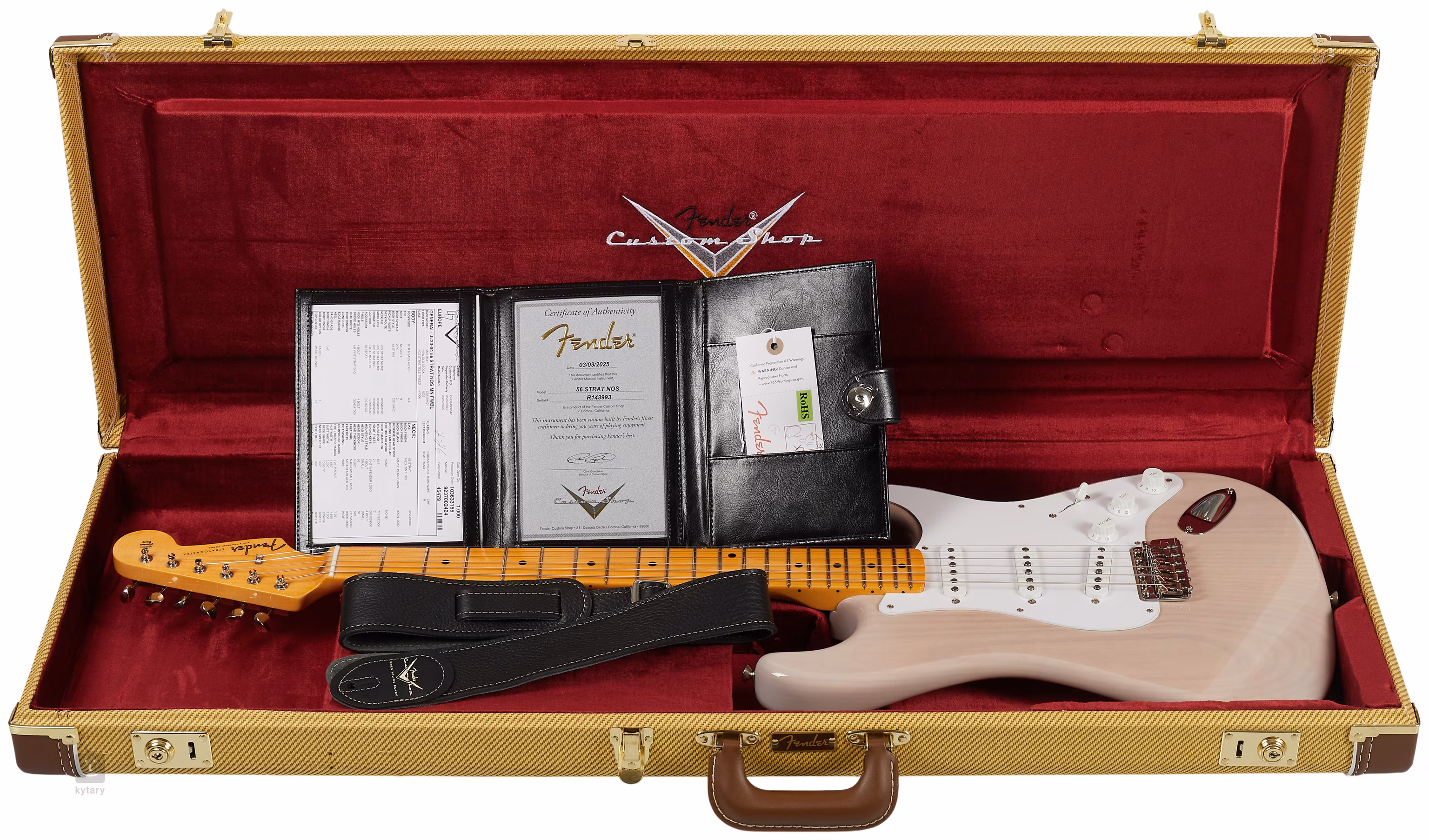 A húrok a csontból készült nullás fogólapon keresztül vannak rögzítve a gyártó vintage kivitelű hangolókulcsaihoz és a szinkronizált Strat tremolóhoz. A gitár tokban, eredetiséget igazoló tanúsítvánnyal együtt kerül kiszállításra.