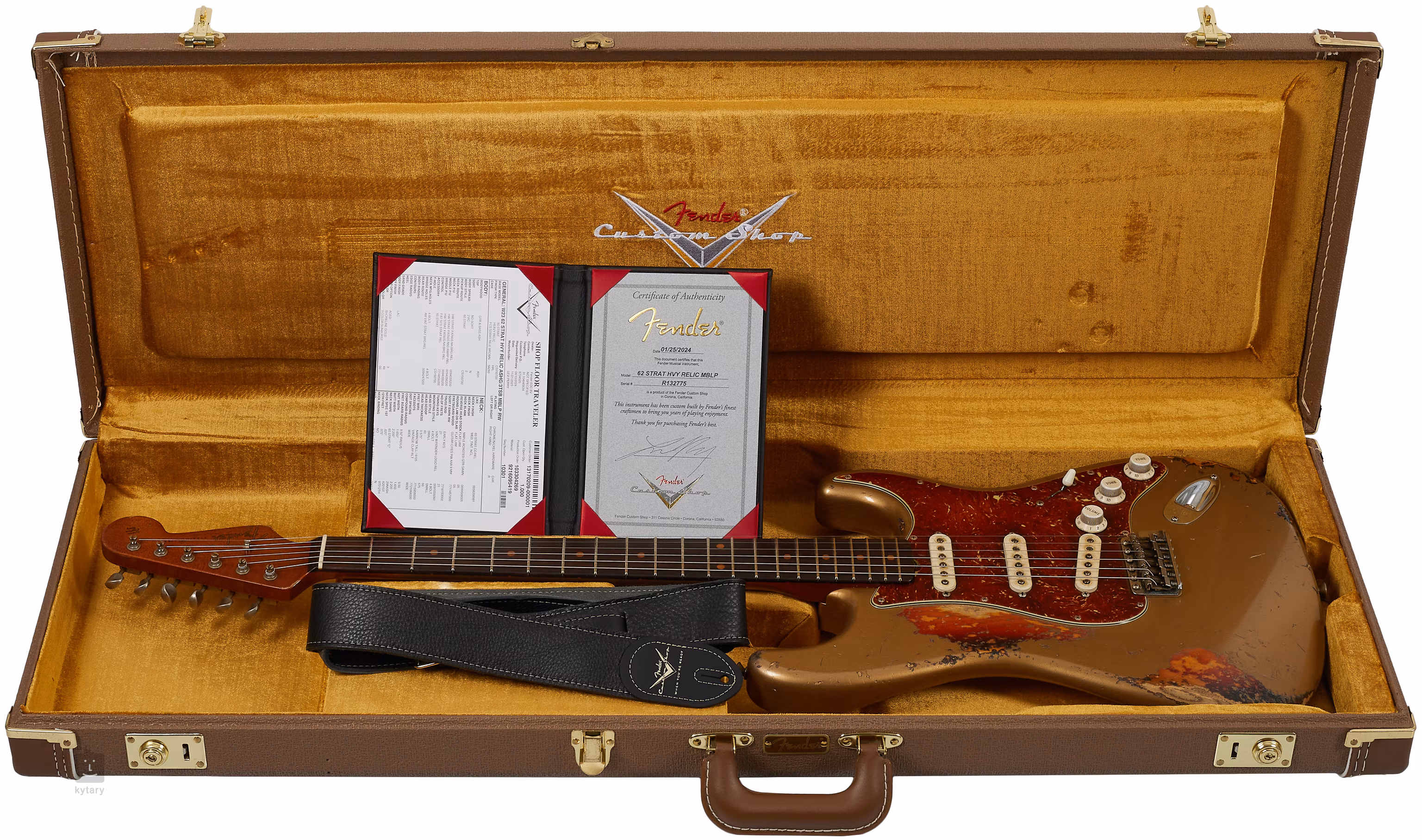 CUSTOM '62 STRAT - HEAVY RELIC, MASTERBUILT BY LEVI PERRY, AGED SHORELINE GOLD OVER 3-COLOR SUNBURST a Fender Custom Shop mesteri hangszere, amelyet Levi Perry gitármester készített neked. Ez egy Fender Stratocaster Heavy Relic kivitelben, a hamis patina jellegzetes elemeivel, "karcos lakkozás", kifakult hardverek és egyéb harci hegek formájában, amelyek meggyőzően idézik az évtizedes intenzív játékot és koncertezést, annak ellenére, hogy ez egy vadonatúj, nem butik/bazár hangszer. A gitár korának tökéletes illúzióját a Shoreline Gold over 3-Color Sunburst fényezés hangsúlyozza.