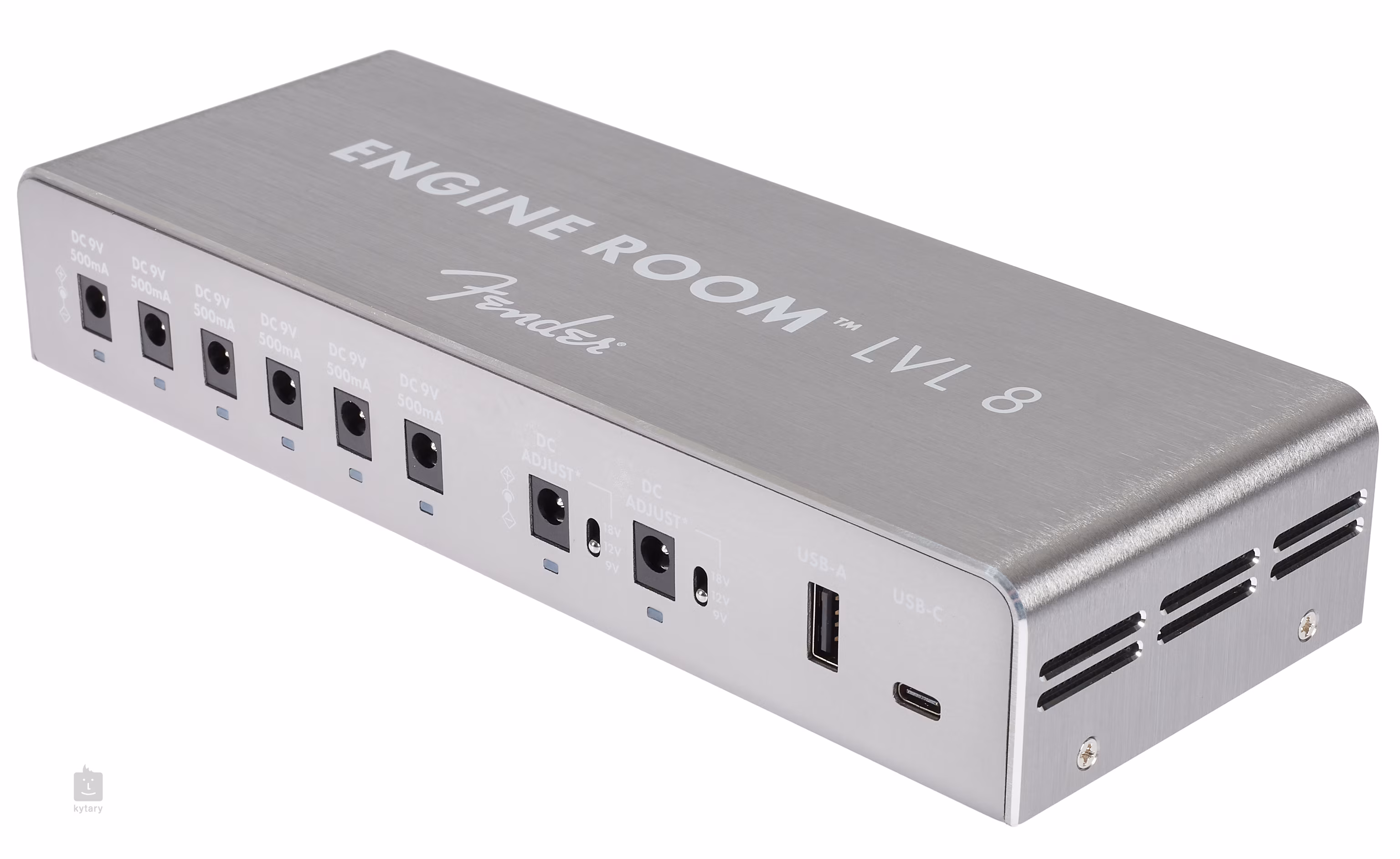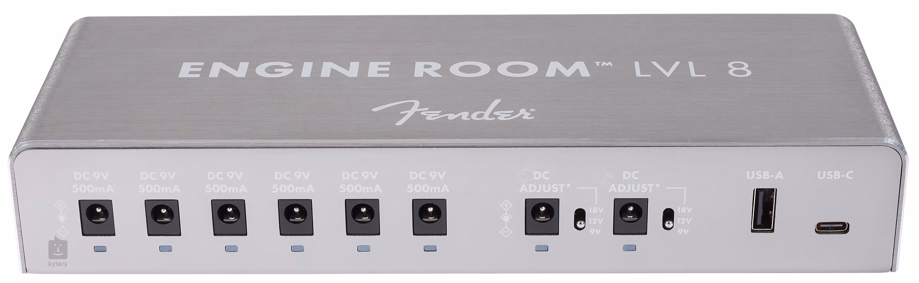 A Fender Engine Room LVL8 tápegység nyolc izolált kimenetet kínál a pedálfalban lévő effektpedálok táplálásához - hat 9V-os, maximum 500mA felvétellel és két választható feszültséggel (9/12/18V). Így könnyedén képes nyolc effektet táplálni egy közepes méretű pedálfalban. A két 5V-os USB-A és USB-C kimenetet mobil eszközök táplálására használhatja. A multiadapter váza könnyű, tartós eloxált alumíniumból készült. Mindegyik kimenethez egy-egy kétszínű LED-kijelző tartozik. A bemeneti feszültség 100-240 V, így a multiadaptert szinte bárhol a világon használhatja.