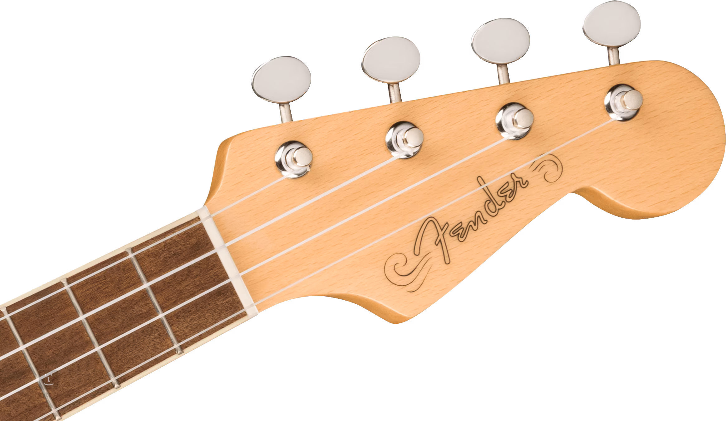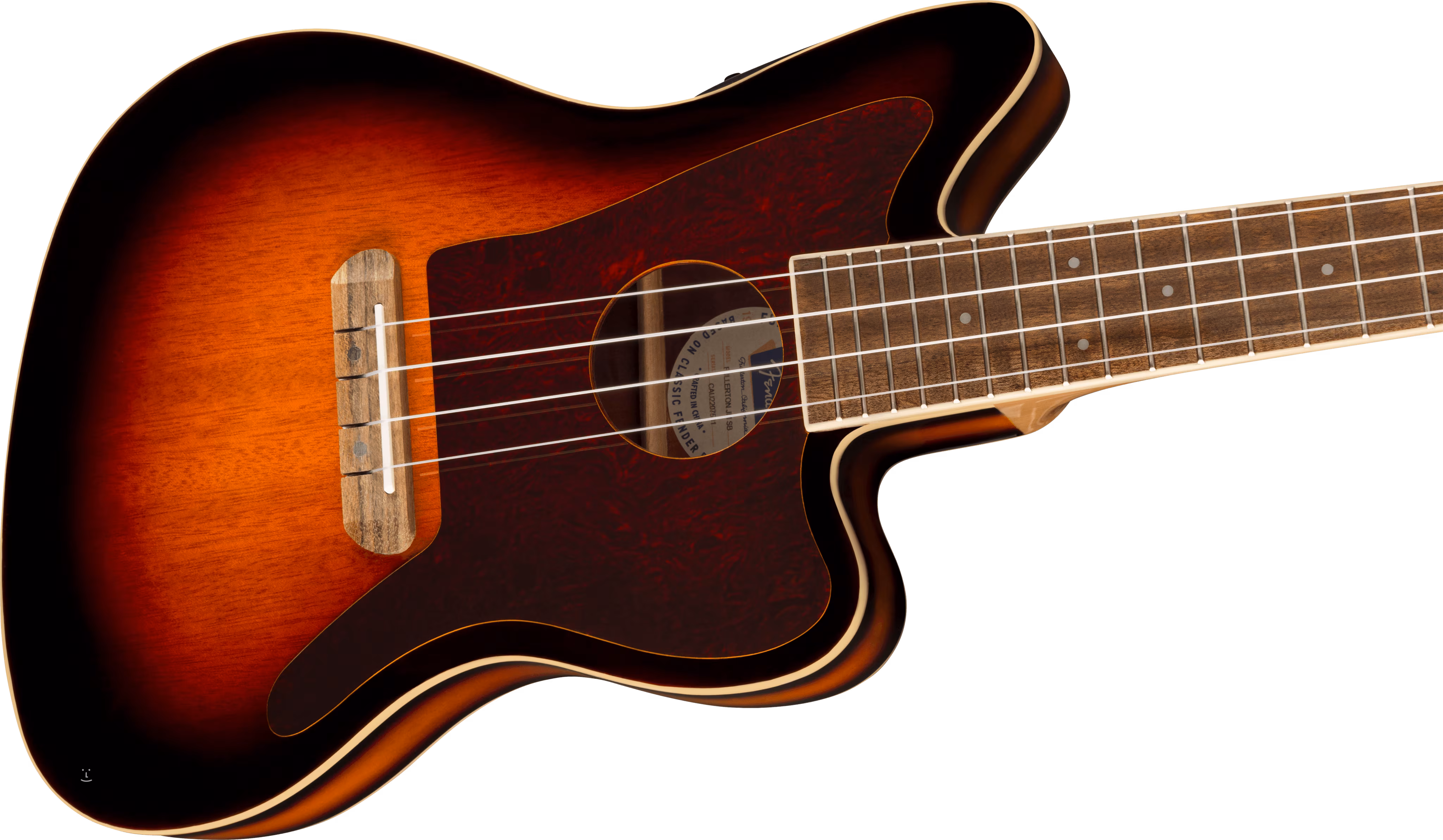 Maga a Fullerton Jazzmaster Uke 3-Color Sunburst ukulele teste laminált lucfenyő előlapból és okoumé hátlapból és oldalból készült. A juhar nyakhoz egy diófa fogólap van ragasztva, amely tizenkilenc bunddal és a könnyű tájékozódást segítő fehér pozíciós pontokkal van ellátva. A húrokat egy műcsont fogólapon keresztül rögzítik a már említett, összetéveszthetetlen Fender-dizájnú 4-in-line nikkel mechanikában és diófa fogólapon.