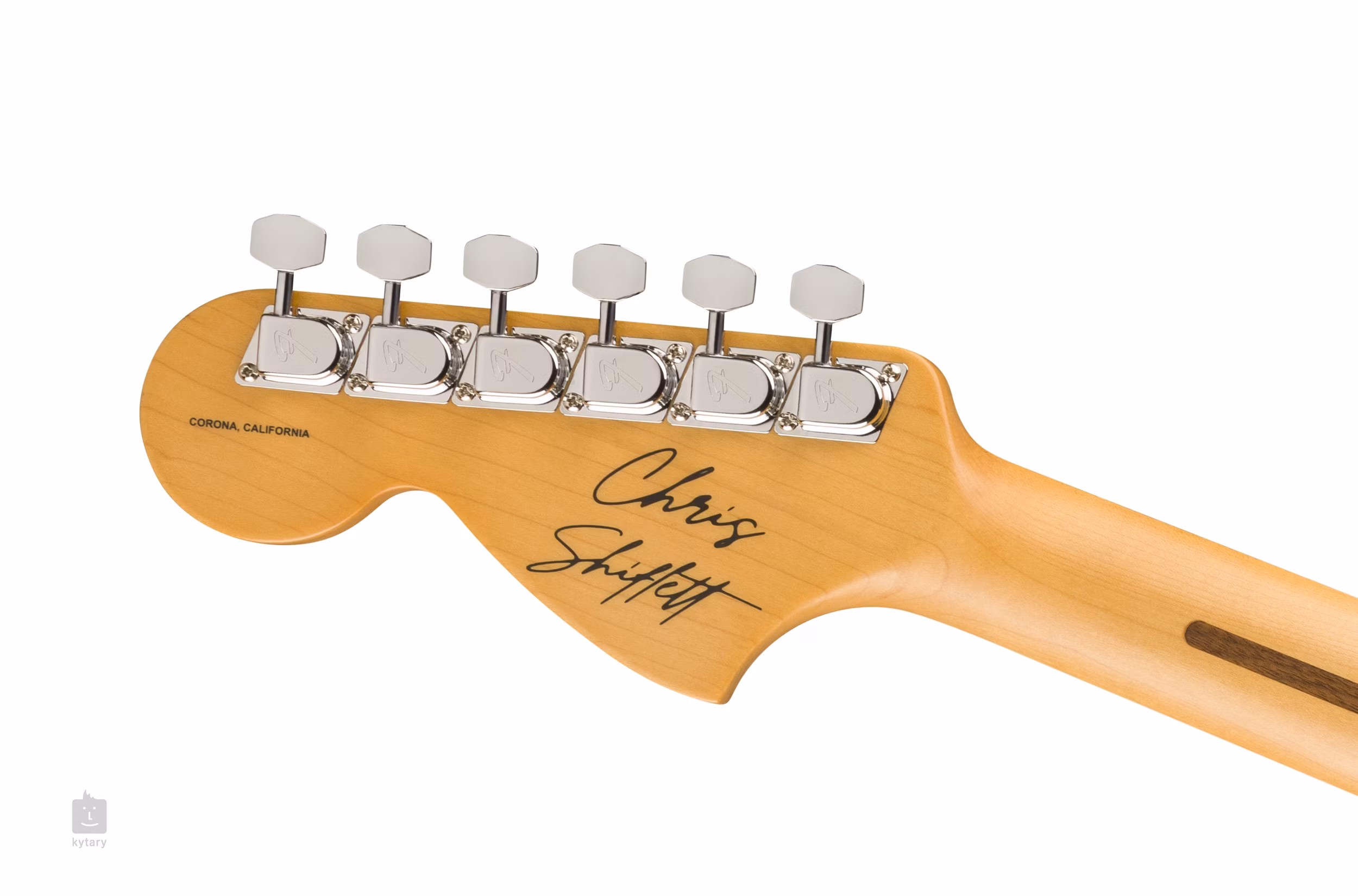 Két Custom Chris Shiflett "Cleaver" Noiseless CS-90 hangszedő nagyobb kimeneti teljesítményű, ütős közepekkel és éneklő magasakkal adja a gitárnak a piszkos rock zúzását és mocskát, valamint a gyönyörűen énekelhető hangokat - plusz nemkívánatos zajok nélkül. A hangzás karakterét a hangerő-potenciométerek, a hangszínszabályzó és a háromállású hangszedő kapcsoló segítségével állíthatod be. A húrok a Pure Vintage Fender mechanikába vannak szerelve, és a testen keresztül egy acél nyereghídon keresztül. A stílusos kivitelezést a háromrétegű, mentazöld színű pickguard emeli ki.