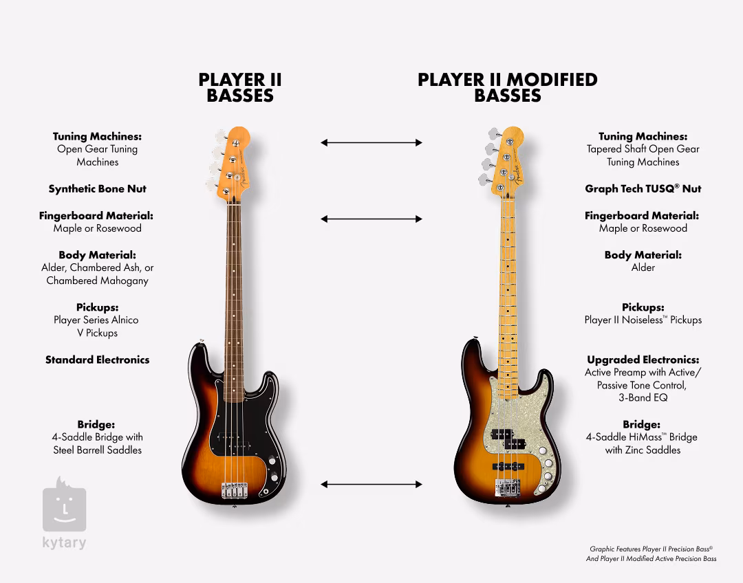 A Player II zajmentes PJ hangszedők a klasszikus Fender "puffanást" és morajlást ötvözik a modern technológiával a nem kívánt zajok kiküszöbölése érdekében. Az új, passzív üzemmódra kapcsolható aktív előerősítő és a továbbfejlesztett EQ szekció pontos kontrollt biztosít a játékosok számára a hangszín felett, így a hangzás könnyen az egyéni preferenciákhoz igazítható.