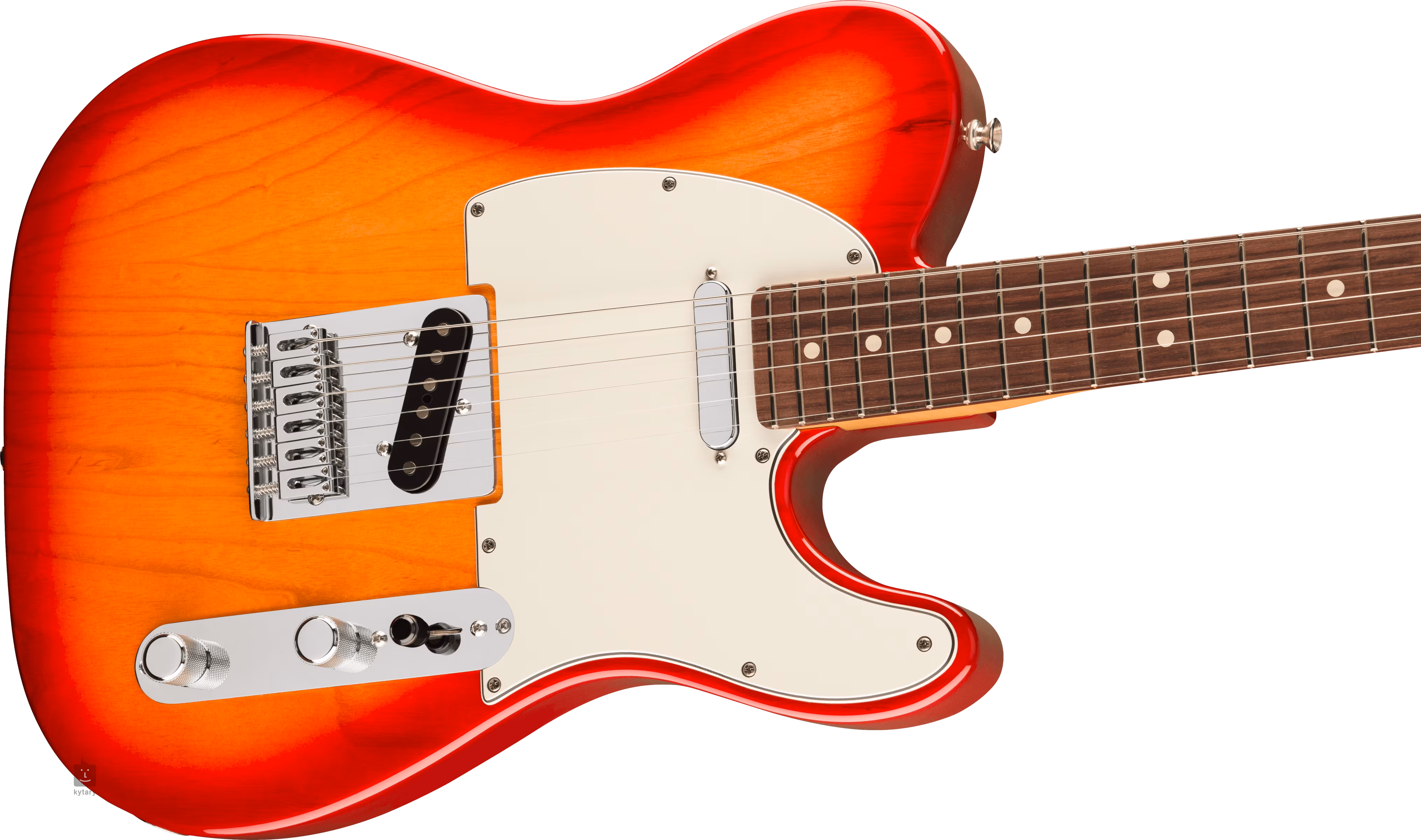 A két Player Series single-coil hangszedő Alnico 5 mágnessel olyan modern Fender-érzetet és hangzást kölcsönöz a gitárnak, amelyet a zenei stílusok széles skáláján értékelni fogsz. A hangzás karaktere a hangerő- és hangszínszabályzóval, valamint a háromállású hangszedő kapcsolóval manipulálható. A stabil hangolást a húrok 18:1 áttételű ClassicGear fogaskerekekbe való rögzítése biztosítja, a testet átívelő, hat acélnyereggel ellátott masszív hídon keresztül. A gitár stílusos megjelenését a fényes, háromrétegű koptatóvédő és a fényes Aged Cherry Burst fényezés emeli ki.
