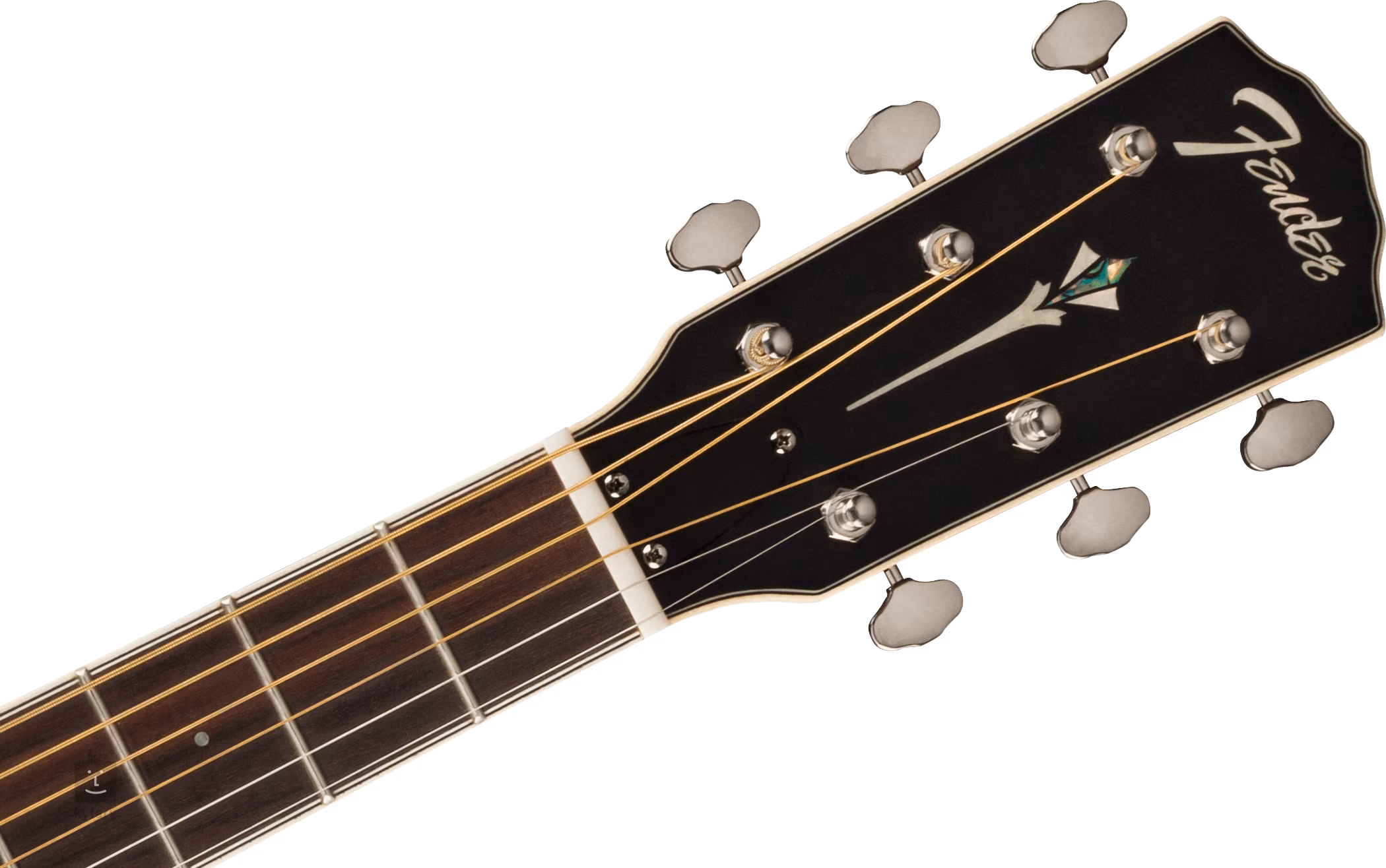 A Fender PR-180E egy elektroakusztikus, kerek nyakú rezonátor, amelynek hangja a hagyományos és a modern zenei stílusokban egyaránt kiemelkedik. A laminált mahagóni test a melegség és a tisztaság egyensúlyát kínálja a fingerstyle játékhoz, míg a spider kúp rezonátor biztosítja a bluegrass hangzáshoz elengedhetetlen jó fenntartást. A tizenkilenc bunddal ellátott diófa fogólap egy "Small V" profilú mahagóni nyakra van ragasztva. A húrokat nyitott nikkel mechanikában és húrozókban (trapéz) rögzítik egy csont nulla bundon keresztül. A stílusos kivitelezést kiemeli az Aged Cognac Burst fényezés, a hópehely pozíciójelzők a fogólapon, a két F lyuk és a nikkel hardver.