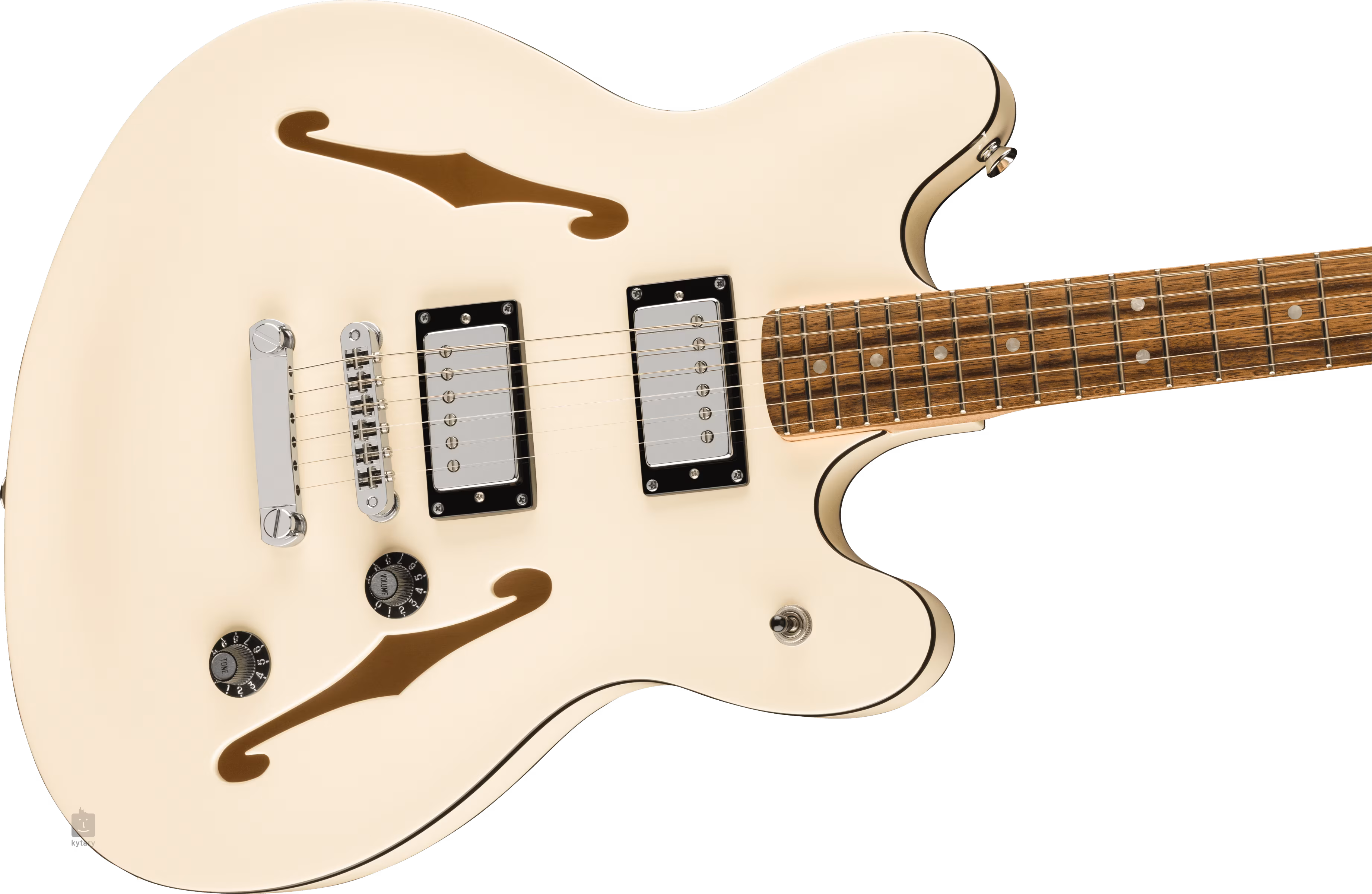Aszimmetrikus ívű, félig üreges testű Affinity Series Starcaster Deluxe Olympic White Affinity sorozatú gitár laminált juharból és a hanglemezt erősítő középső blokkból készül. A "játékosbarát" C-profilú, csavarozott juhar nyak egy huszonkét Medium Jumbo bunddal ellátott fügefa fogólapra van ragasztva. A fogólap tájékozódását gyöngyházutánzatú pozíciópontok segítik.