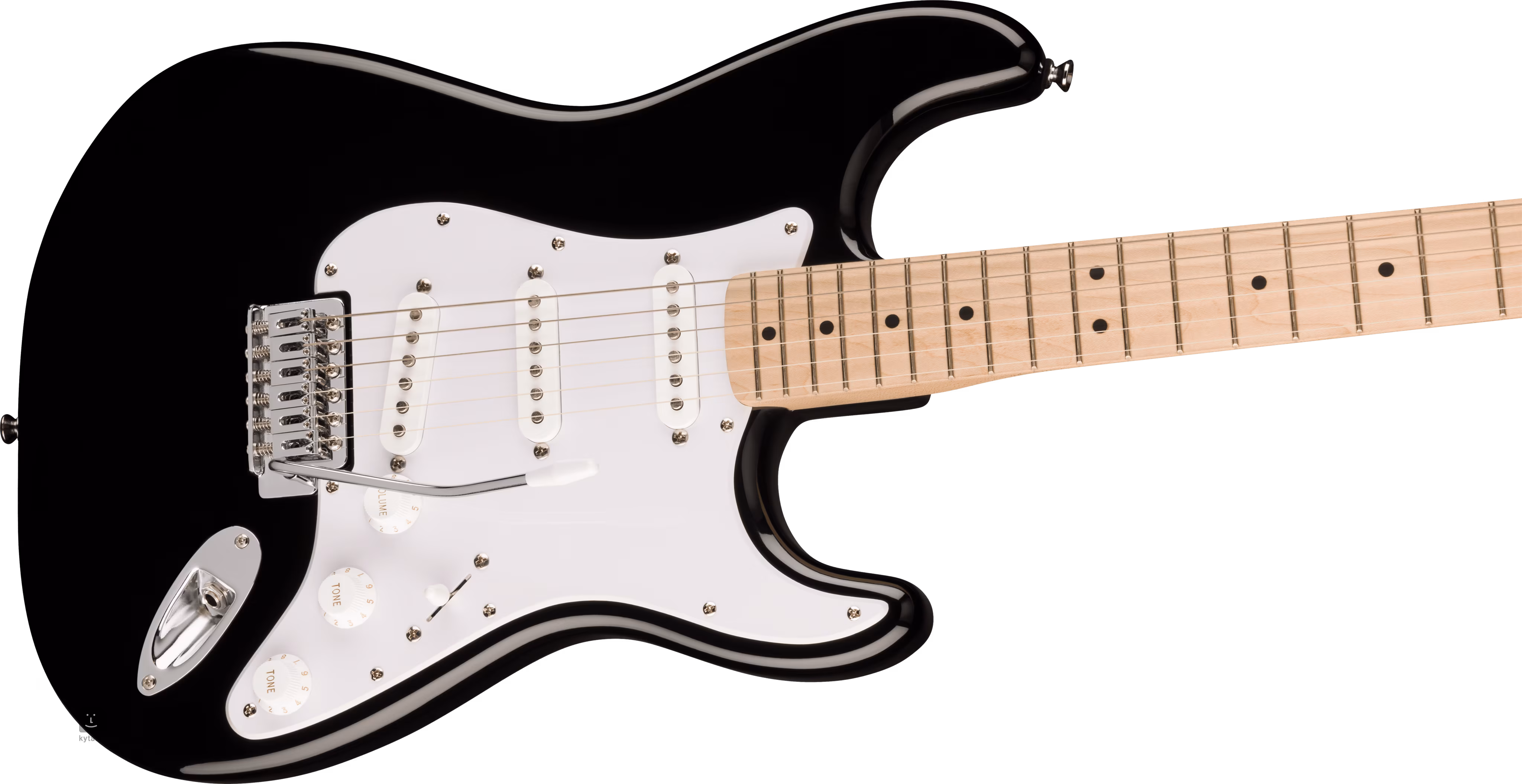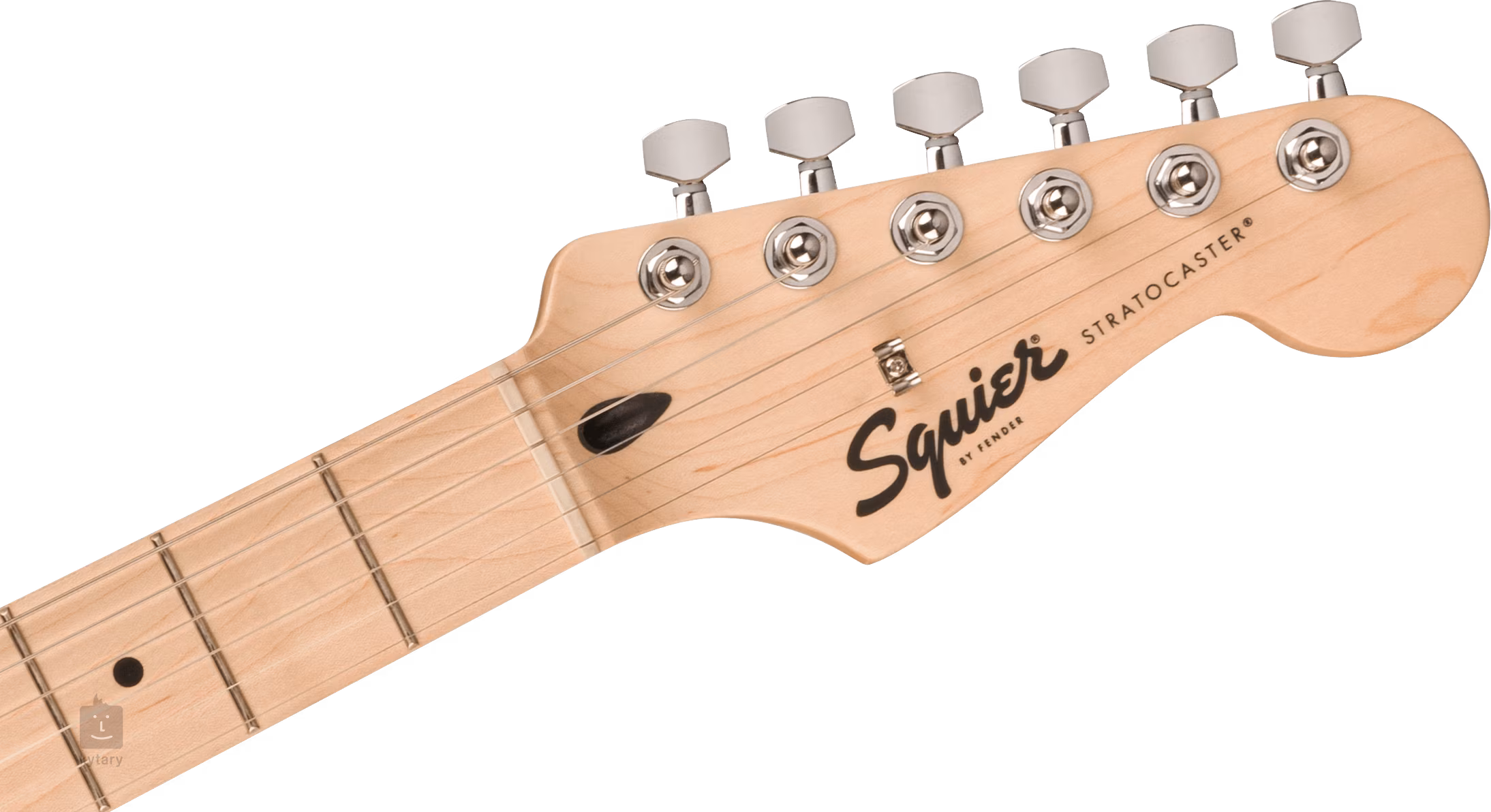 A Fender Squier SONIC STRAT MN WPG BLK egy megfizethető, sallangmentes elektromos gitár, amely kezdő gitárosok számára alkalmas. A hangszer nyárfa testét fényes poliuretán lakk borítja. A "C" profilú nyak és a fogólap juharból készült, a fogólap felületét huszonegy Narrow Tall bund és fekete pozíciós pontok tagolják.