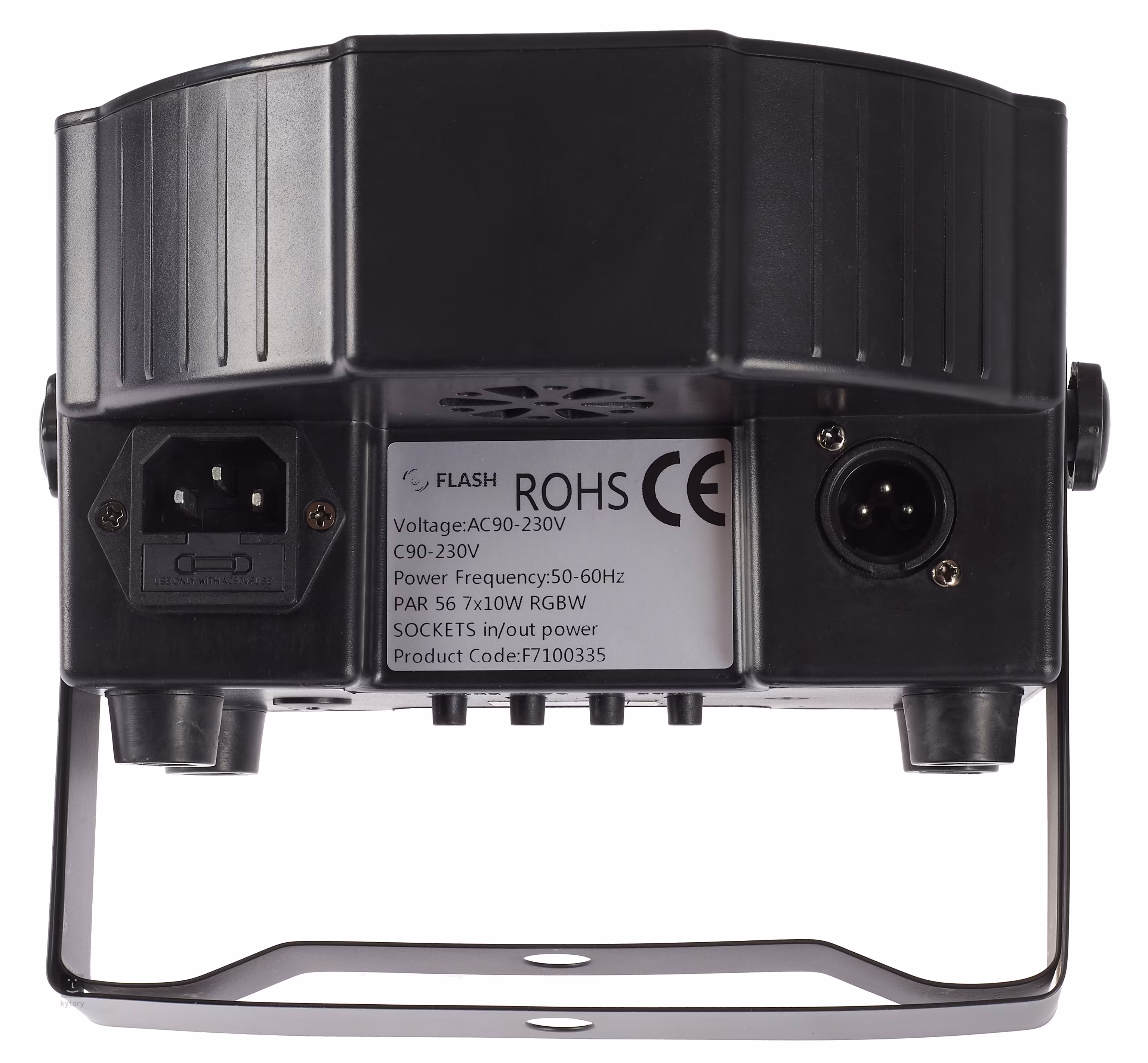 A LED PAR56 7x10W RGBW + IR a Flash-től egy kompakt és könnyű, mégis meglepően erős LED PAR reflektor, amely különösen nagyszerű mobil eszközként utazó világításhoz és zenészek számára. Lehetővé teszi, hogy megbízhatóan megvilágítson egy kisebb zenei rendezvényt, esküvőt vagy vállalati eseményt. Fényforrása hét 10W-os RGBW (4in1) LED (piros, zöld, kék és fehér), amelyek rengeteg lehetőséget biztosítanak a színek keveréséhez és a fényhatások létrehozásához. Állítható villogási sebességű stroboszkóphatás és fényerőszabályzó is rendelkezésre áll.
