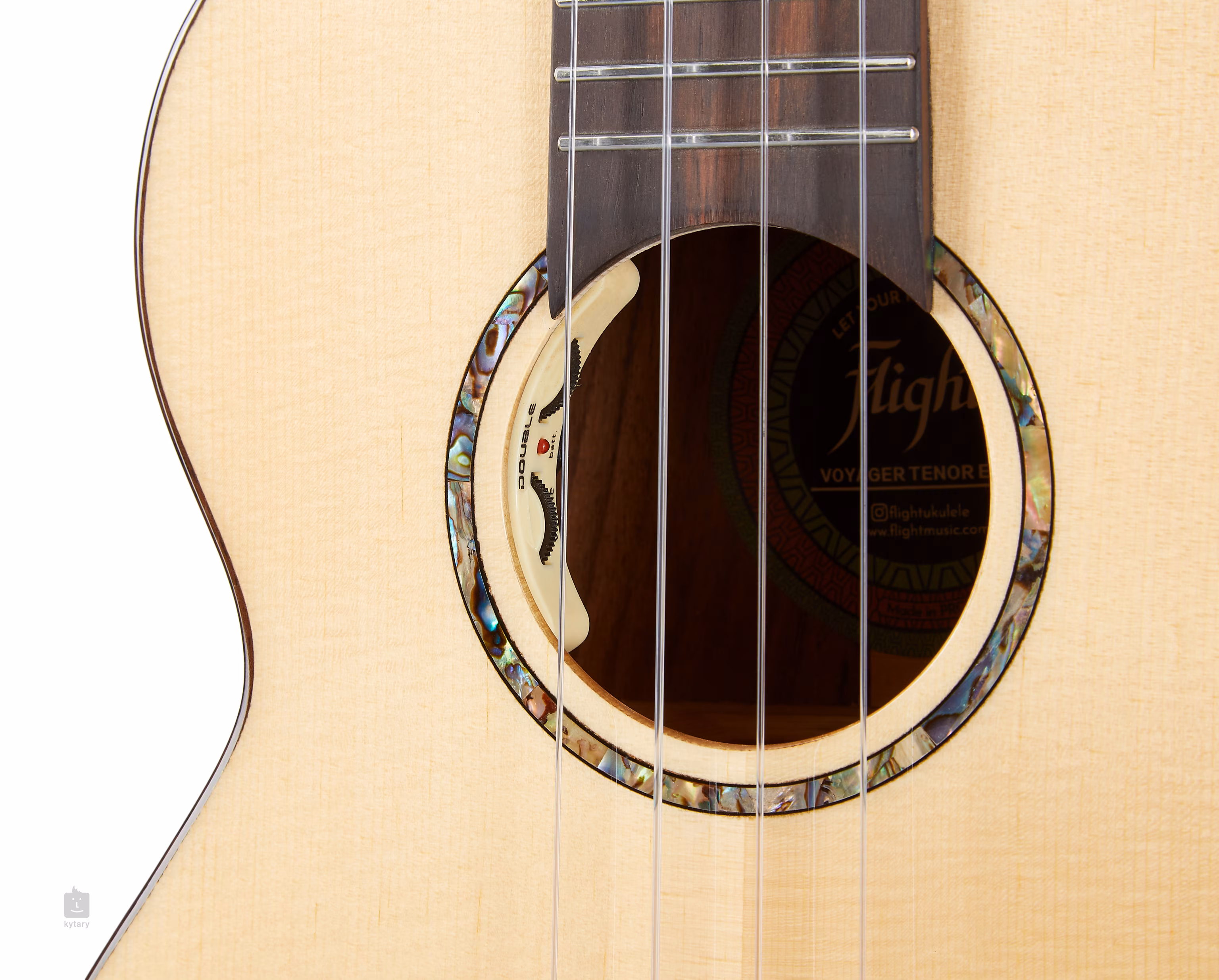 A Voyager tenor ukulele eleje tömör Sitka lucfenyőből, míg a hátlap tömör akácból készült, amely lágyítja az átható lucfenyő tetejét. A nyak és a fogólap anyagválasztása a prémium hangszerekben bevált fafajták, az afrikai mahagóni és a paliszander, amelyeket prémium hangszerekben használnak. A játékkomfortot az ébenfa válltámasz emeli magasabb szintre.