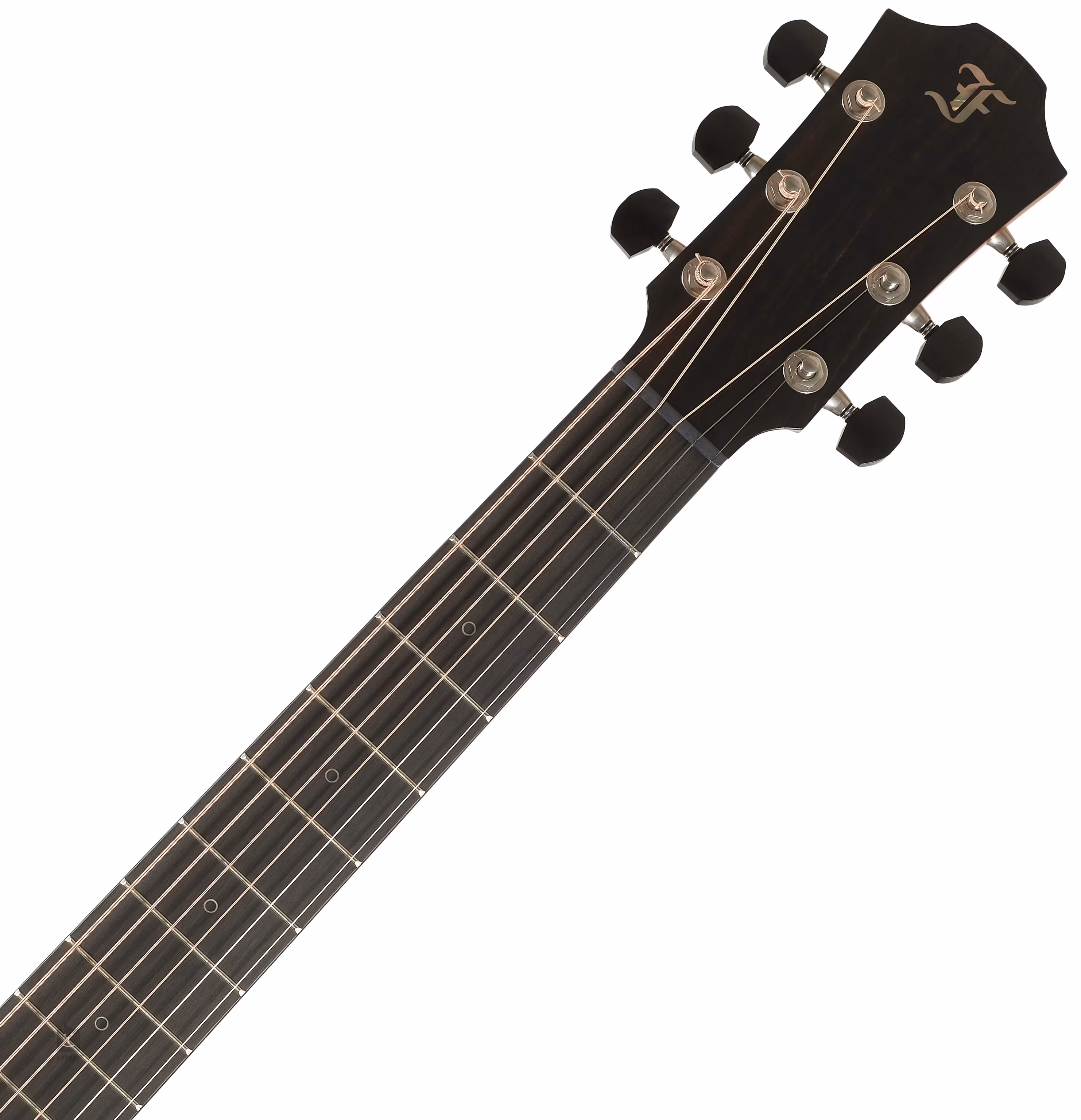 Az ébenfa fogólapon az elegáns elülső pozíciójelölések vékony kontúrvonallal fehér gyöngyházból és oldalsó gyöngyház pontjelölésekkel megkönnyítik a tájékozódást. Az átlátszó pickguard kiemeli a fa természetes mintázatát, ugyanakkor nem befolyásolja a fedlap rezonanciáját. A stabil hangolást a csúcsminőségű Gotoh 510 mechanika biztosítja, ezüst patinával, csiszolt ébenfa csapokkal és 1:21-es finom áttételi aránnyal. A szép kivitelezést finom részletek hangsúlyozzák, mint például a műgyöngyház szegélyezés és a dupla gyűrűs rozetta, zöld abalón intarziával és fekete-fehér vonallal.
