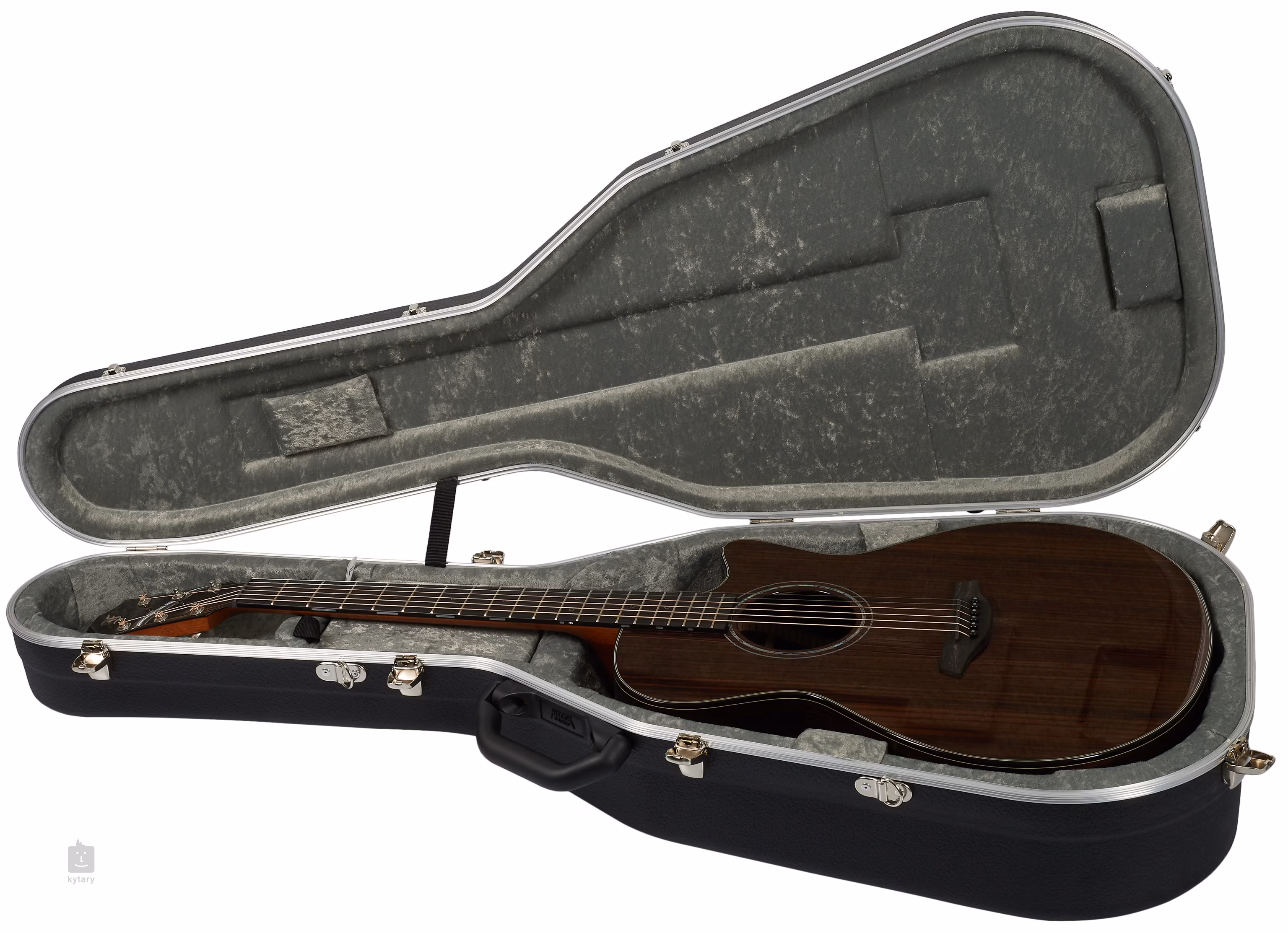 Az ébenfa fogólapon való tájékozódást elegáns, vékony fehér gyöngyház kontúrvonallal ellátott elülső pozíciójelzők és oldalsó gyöngyház pontjelzők segítik. Az áttetsző koptatótakaró kiemeli a fa természetes szemcsézettségét, miközben nem befolyásolja a hangfal rezonanciáját. A stabil hangolást a csúcsminőségű, ezüst patinás Gotoh 510-es szerkezet garantálja, polírozott ébenfa fogantyúkkal és egy rendkívül kifinomult, 1:21-es áttételű fogaskerékkel. A finom kidolgozás finom részleteit a faux tortoiseshell testkötés és a zöld abalone intarziával ellátott, fekete-fehér vonallal díszített dupla gyűrűs rozetta formájában finom részletek emelik ki.