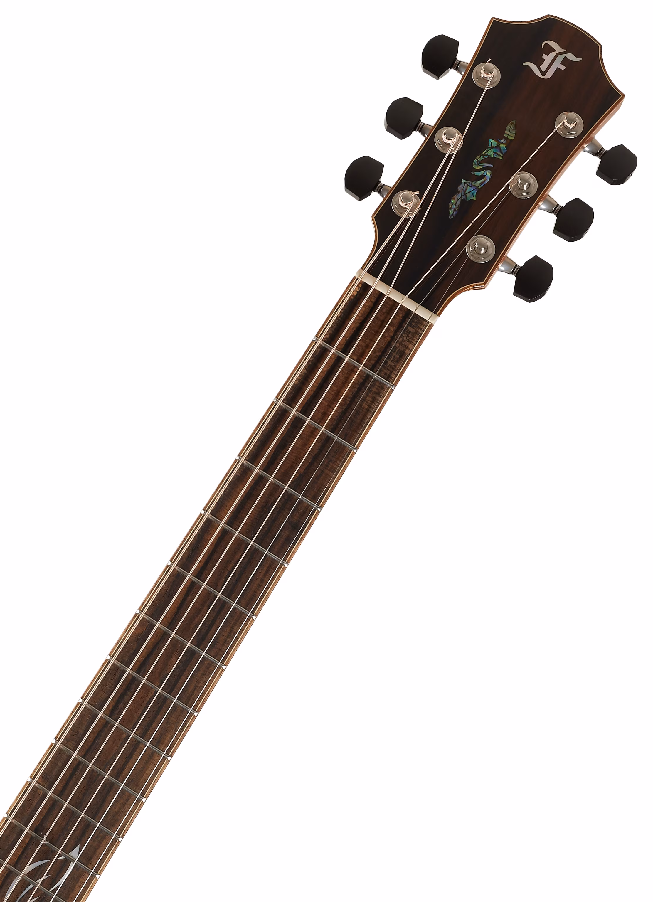 Az exkluzív közép-amerikai Ziricote fából készült, jellegzetes mintázatú fogólapot levél alakú gyöngybetét díszíti, a fejlécen pedig hasonló természetes mintázatú zöld abalone található. Az áttetsző koptatótakaró kiemeli a fa természetes szemcsézettségét, miközben nem befolyásolja a hangfal rezonanciáját. A stabil hangolást a csúcsminőségű, ezüst patinás Gotoh 510-es mechanika garantálja, polírozott ébenfa fogantyúkkal és 1:21-es áttétellel. A gitár fényűző megjelenését a ciricote fából készült fejléc és a fejléc fogólap, a test, a fogólap és a fejléc kötése, valamint a hawaii koa végblokk díszítés, az abalone gyöngyös fejléc intarzia és a prémium hawaii koa és abalone gyöngyös gyűrűs rozetta emeli ki.