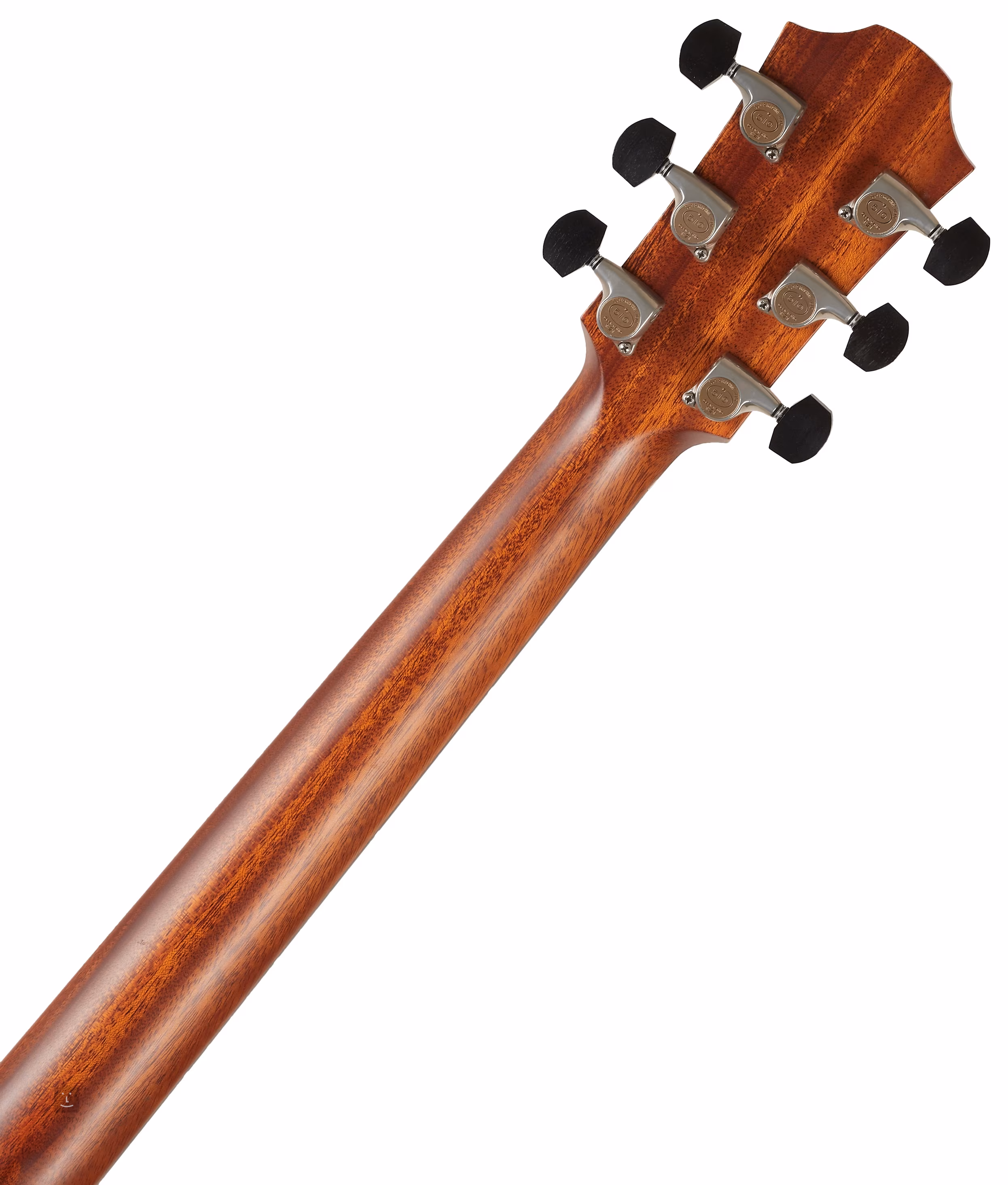 Az ébenfa fogólapon az elegáns, kör alakú pozíciójelölők vékony, fehér gyöngyház kontúrvonallal és oldalsó gyöngyház pontjelölőkkel megkönnyítik a tájékozódást. Az átlátszó pickguard kiemeli a fa természetes mintázatát, ugyanakkor nem befolyásolja a fedlap rezonanciáját. A stabil hangolást a csúcsminőségű Gotoh 510 mechanika biztosítja, ezüst patinával, csiszolt ébenfa csapokkal és 1:21-es finom áttételi aránnyal. A szép kivitelezést finom részletek hangsúlyozzák, mint például a műgyöngyház szegélyezés és a dupla gyűrűs rozetta, zöld abalón intarziával és fekete-fehér vonallal.