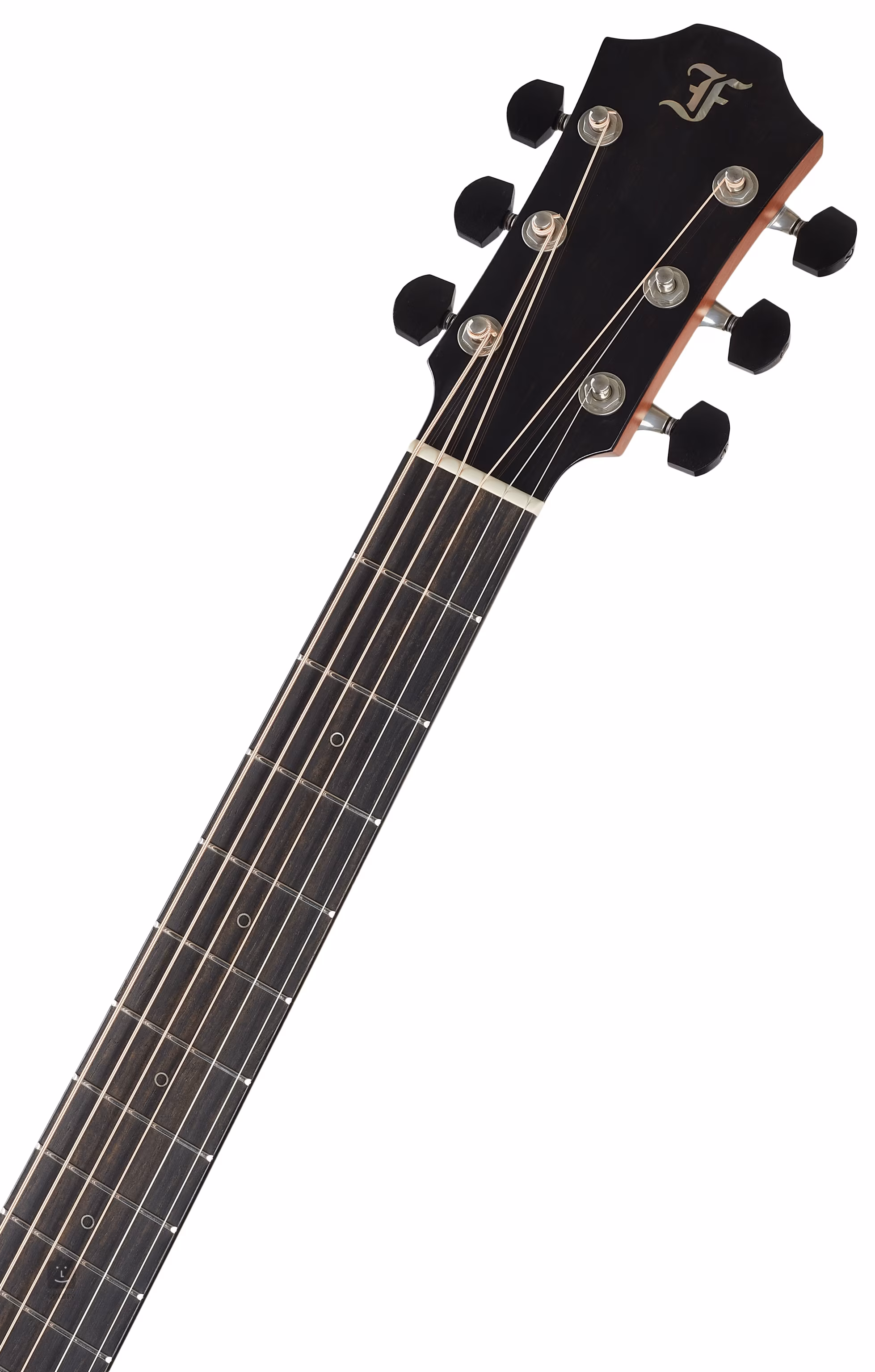Az ébenfa fogólapon az elegáns, kör alakú pozíciójelölők vékony, fehér gyöngyház kontúrvonallal és oldalsó gyöngyház pontjelölőkkel megkönnyítik a tájékozódást. Az átlátszó pickguard kiemeli a fa természetes mintázatát, ugyanakkor nem befolyásolja a fedlap rezonanciáját. A stabil hangolást a csúcsminőségű Gotoh 510 mechanika biztosítja, ezüst patinával, csiszolt ébenfa csapokkal és 1:21-es finom áttételi aránnyal. A szép kivitelezést finom részletek hangsúlyozzák, mint például a műgyöngyház szegélyezés és a dupla gyűrűs rozetta, zöld abalón intarziával és fekete-fehér vonallal.