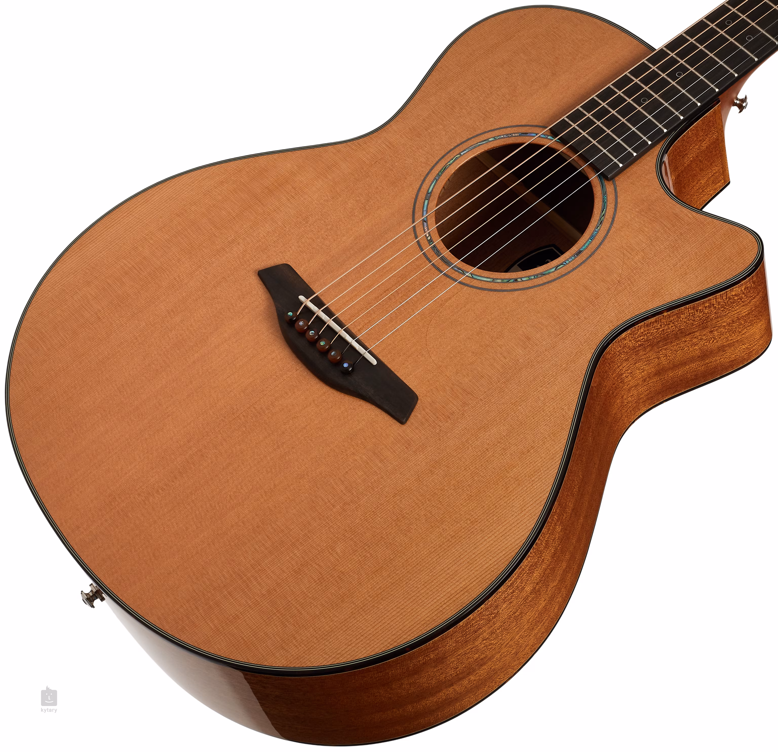 Az ébenfa fogólapon az elegáns, kör alakú pozíciójelölők vékony, fehér gyöngyház kontúrvonallal és oldalsó gyöngyház pontjelölőkkel megkönnyítik a tájékozódást. Az átlátszó pickguard kiemeli a fa természetes mintázatát, ugyanakkor nem befolyásolja a fedlap rezonanciáját. A stabil hangolást a csúcsminőségű Gotoh 510 mechanika biztosítja, ezüst patinával, csiszolt ébenfa csapokkal és 1:21-es finom áttételi aránnyal. A szép kivitelezést finom részletek hangsúlyozzák, mint például a műgyöngyházból készült testszegély és a dupla gyűrűs rozetta, amely zöld abalónból készült, fekete-fehér vonalakkal.
