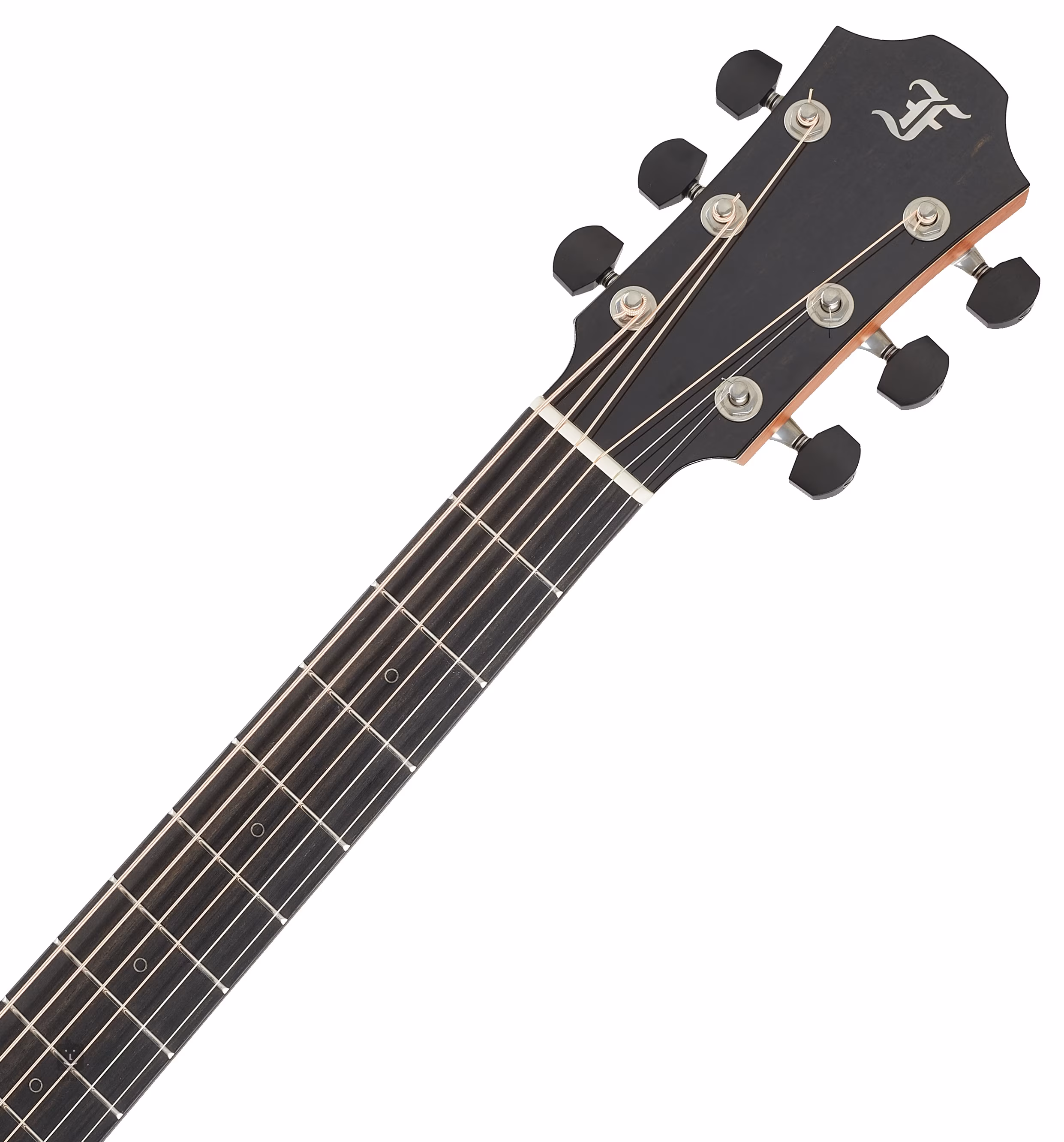 Az ébenfa fogólapon az elegáns, kör alakú pozíciójelölők vékony, fehér gyöngyház kontúrvonallal és oldalsó gyöngyház pontjelölőkkel megkönnyítik a tájékozódást. Az átlátszó pickguard kiemeli a fa természetes mintázatát, ugyanakkor nem befolyásolja a fedőlap rezonanciáját. A stabil hangolást a csúcsminőségű Gotoh 510 mechanika biztosítja, ezüst patinával, csiszolt ébenfa csapokkal és 1:21-es finom áttételi aránnyal.