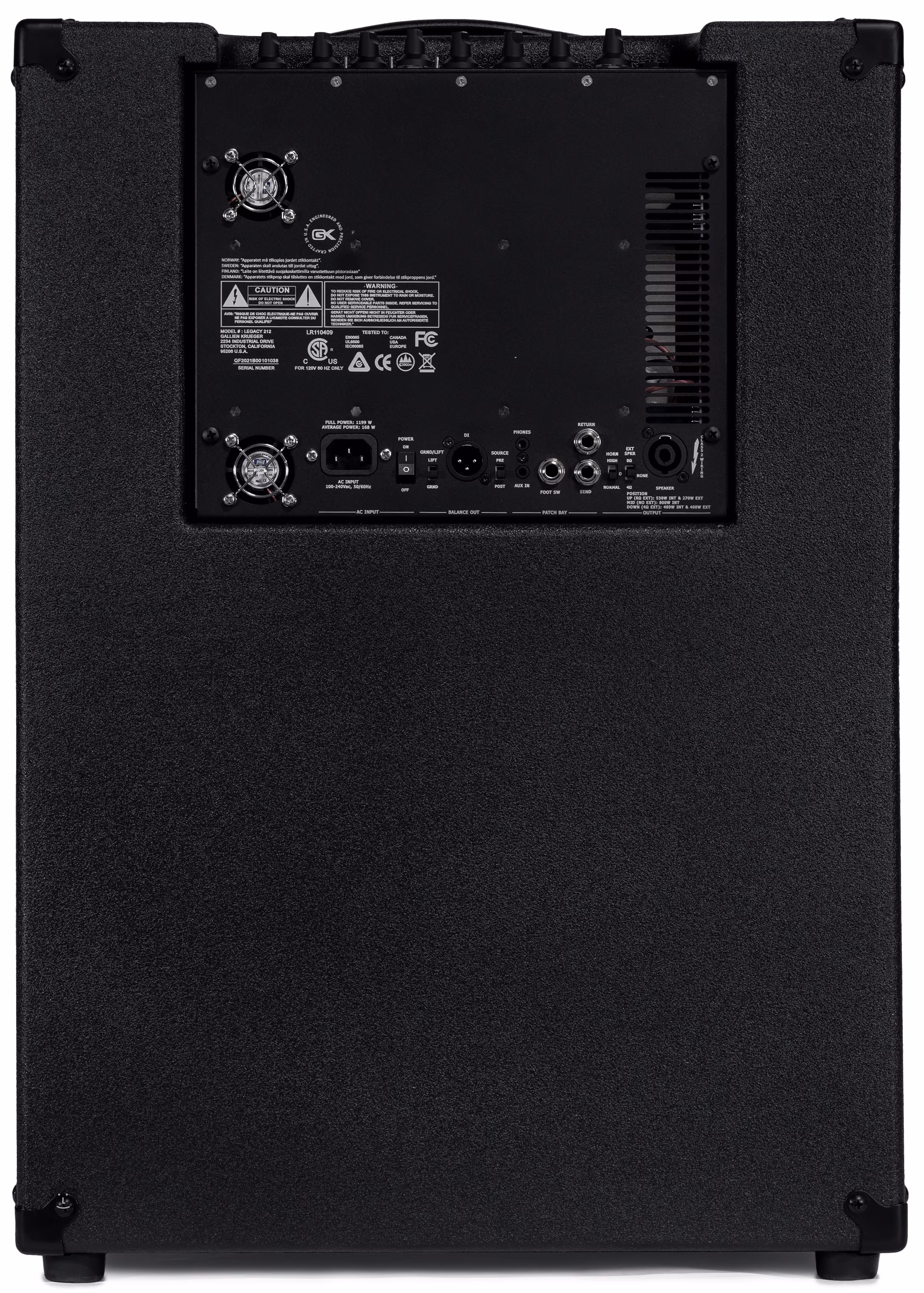 Öt kék LED jelzi a tápcsatlakozást, az aktiválást, a túlmelegedést, a rövidzárlatot és a bemeneti túlhajtást. A váz hátulján mini-jack fejhallgató- és Aux In csatlakozók, egy lábkapcsolós bemenet, egy szimmetrikus XLR vonal kimenet földdel való lecsatlakoztatással és Pre/Post választással, egy send/reverz effekt hurok, egy háromállású kürt kapcsoló és egy Speakon csatlakozó egy külső szekrény csatlakoztatásához.