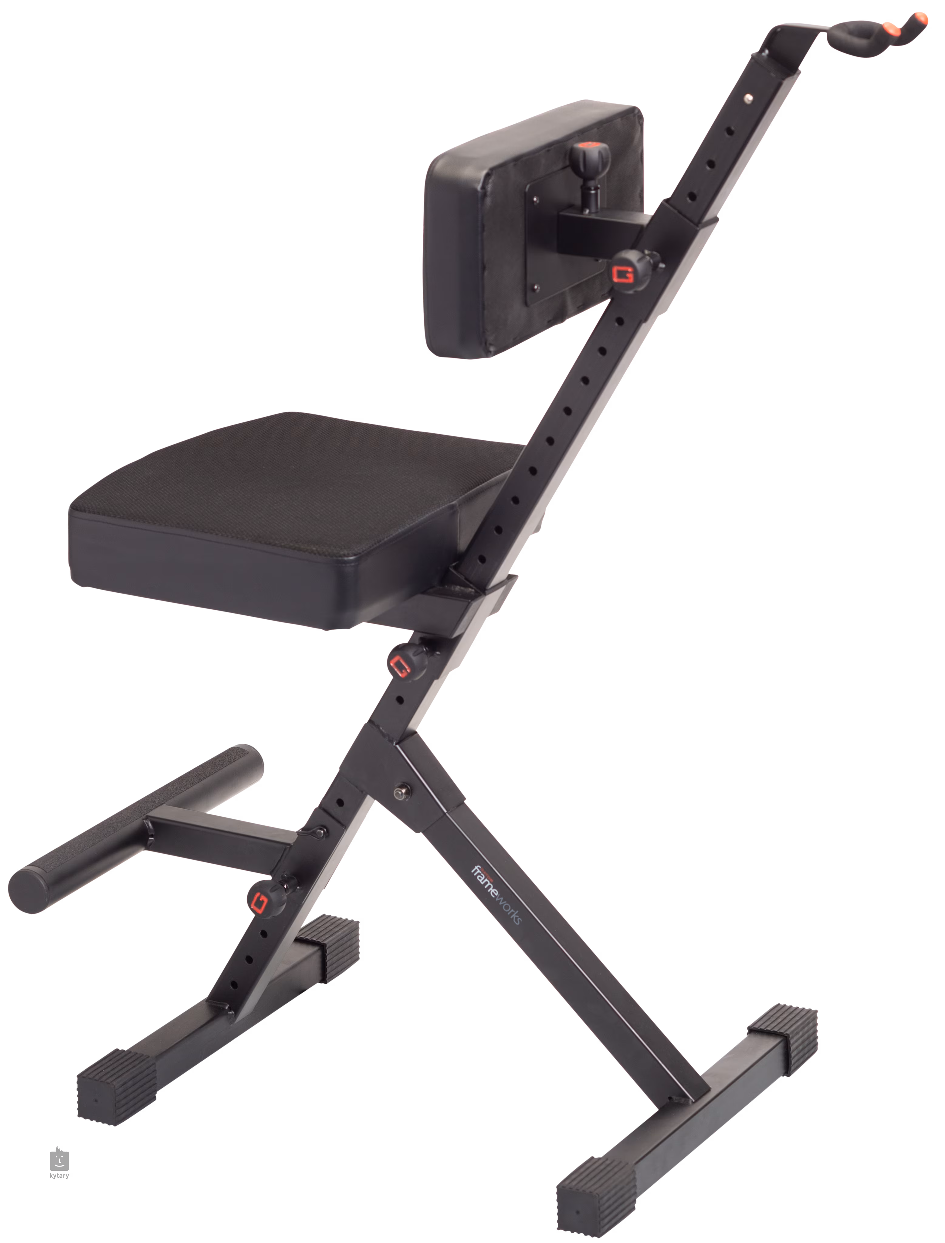 Praktikus gitártartóval kombinált gitárzsámoly a jól ismert Gator Frameworks gyártótól. A tartós alumíniumból készült ülés párnázott, így nem csak kényelmes, de tartós is, és háttámlával rendelkezik, hogy még a hosszabb szeánszokon is kényelmes legyen. Bónusz a három ponton állítható magasságú rendszer.