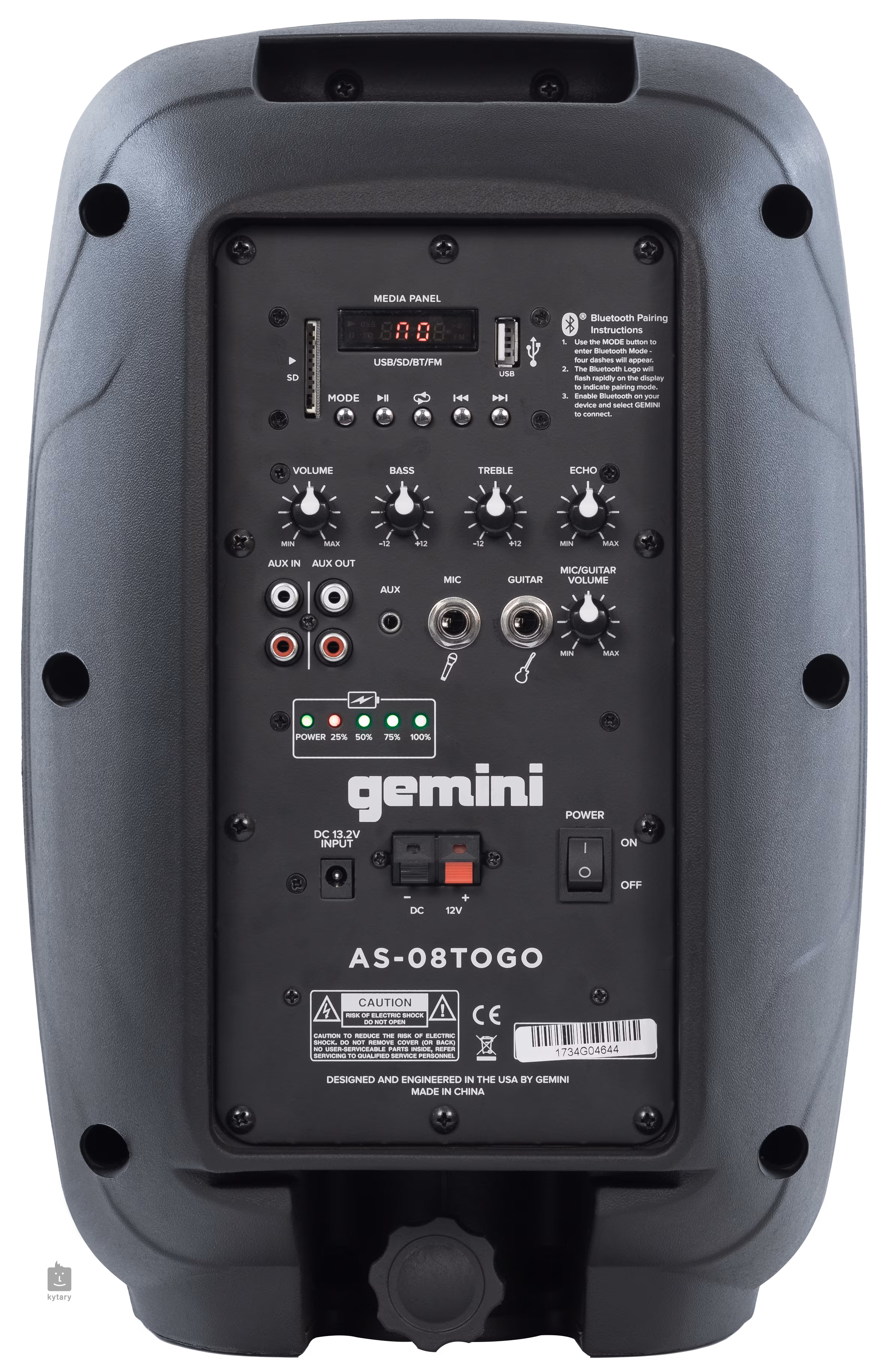 A Gemini AS-08TOGO hordozható aktív hangszóró nélkülözhetetlen eszközzé válik mindazok számára, akik minőségi hangrendszert keresnek a legkülönbözőbb helyzetekben. Magját egy D-osztályú erősítő és egy 8"-os mélysugárzó és egy 1"-os magassugárzó dinamikus kombinációja alkotja, amelyek együttesen erőteljes és kiegyensúlyozott hangzást eredményeznek. Az 500 wattos maximális kimeneti teljesítményével egy kerti parti, jam session vagy más kisebb rendezvény hangosítására is alkalmas. Az akkumulátoros és Bluetooth funkció maximális rugalmasságot biztosít a mozgáshoz és számos csatlakozási lehetőséget.