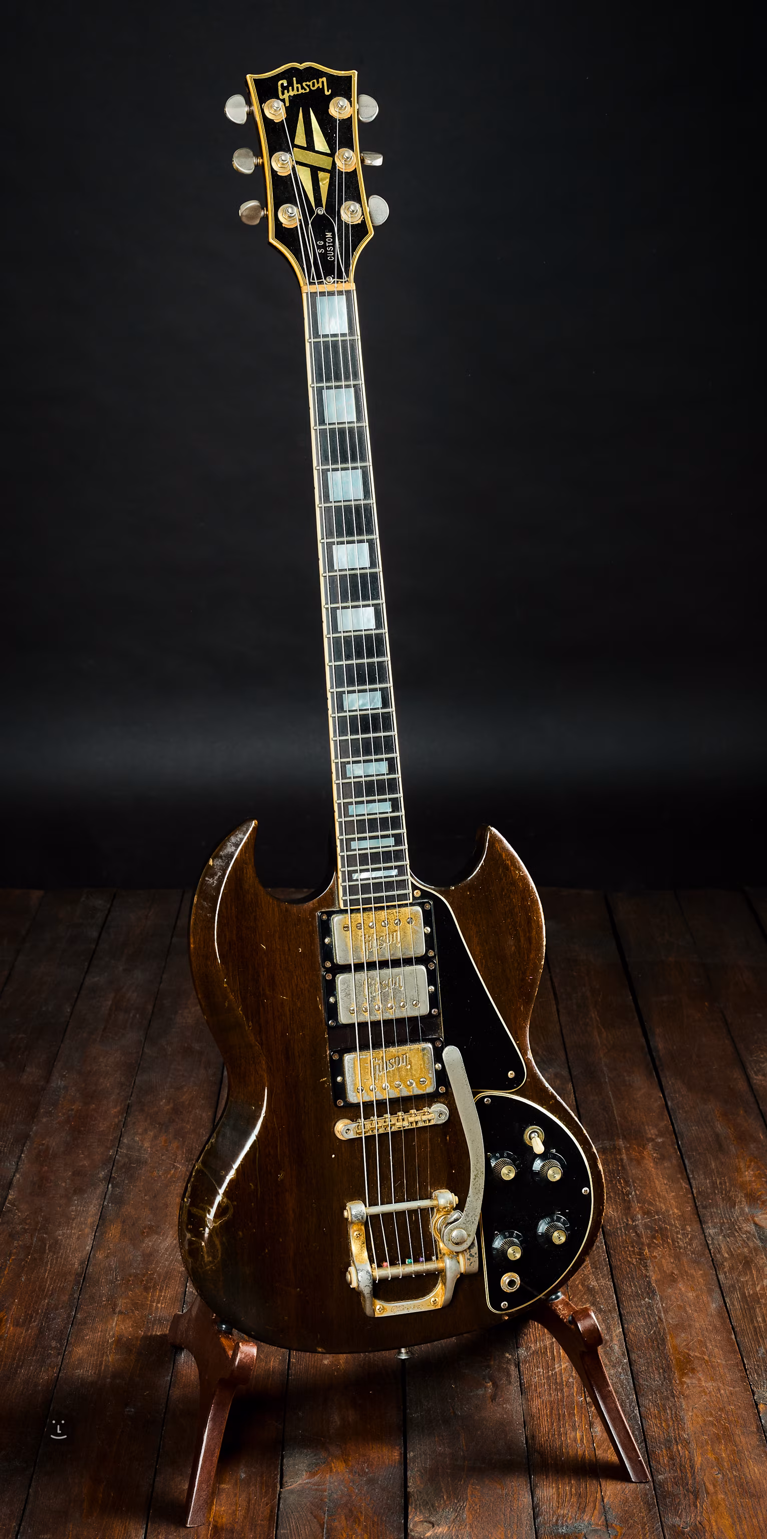 SG Custom arany hardverrel és eredeti Bigsby tremolóval 1974-75-ből! Nagyon hangos és rezonáns. A régi fa első érintésre érezhető, és összetéveszthetetlen élménnyé teszi a hangszerrel való játékot.