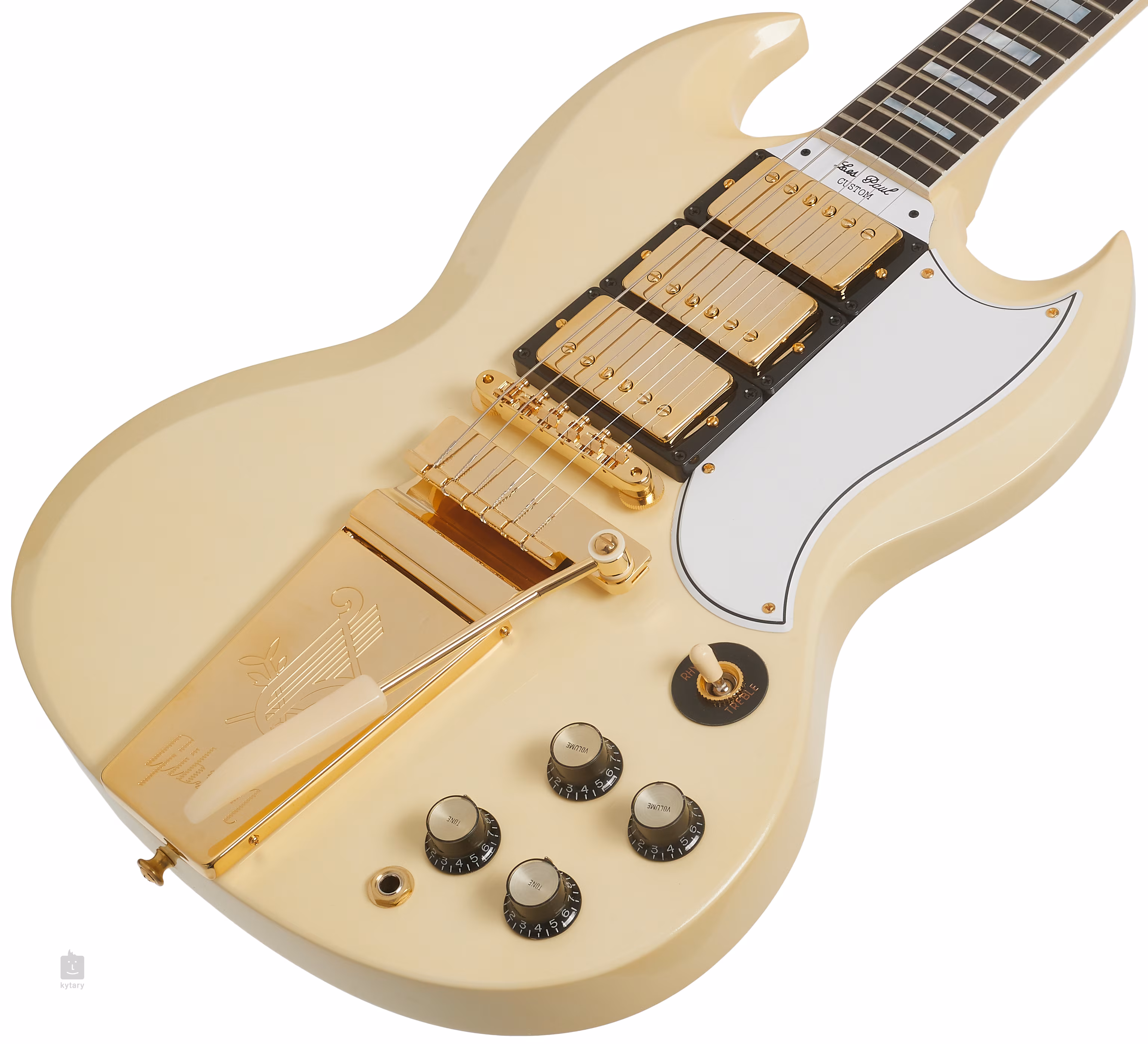 A Gibson SG elektromos gitárok méltán tartoznak a rockzene halhatatlan ikonjai közé. Olyan gitárlegendák, mint Carlos Santana, Pete Townsend és más rockzenei nagyságok neve fűződik a hangzásukhoz.Az 1963-as Les Paul SG Custom Reissue 3-Pickup w/ Maestro VOS Classic White egy történelmileg hiteles "reissue" modell a Gibson Custom Shopból, amely visszautal az 1963-as dizájnra.