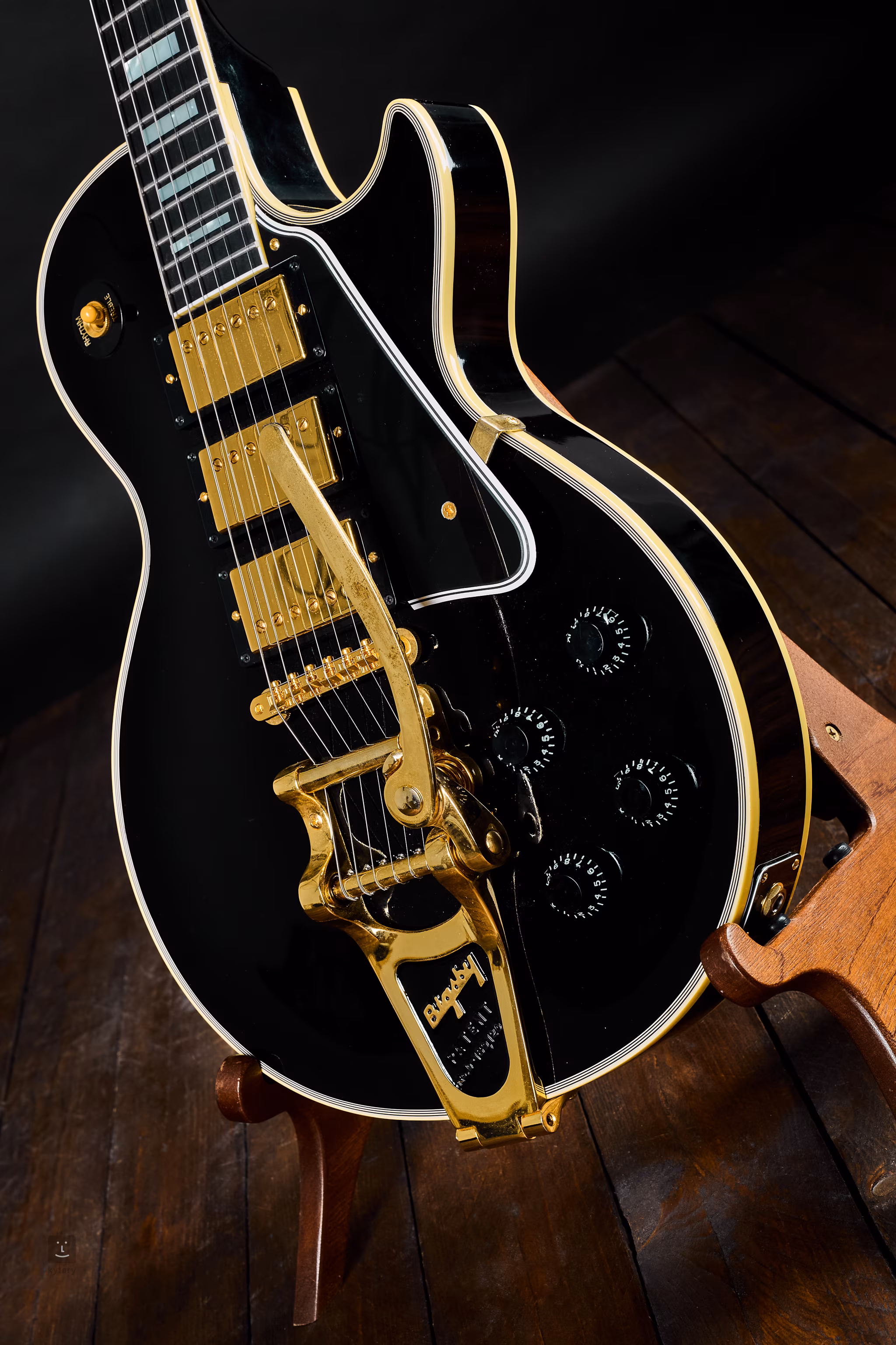 Kevés elektromos gitár nevezhető olyan klasszikusnak és legendásnak, mint a Gibson Les Paul. Ez a 1957 Les Paul Custom Reissue 3-Pickup Bigsby VOS Ebony a csúcsverzió, mert vibratóval és egy harmadik, középső hangszedővel is rendelkezik. A test egy darab mahagóniból készült, mély Ebony színben. A VOS (Vintage Original Specs) felület autentikus megjelenést és „feelinget” ad. A mahagóni nyakra tömör ében fogólap került 22 bunddal (Historic Medium-Jumbo). A hangért három Custombucker Alnico III humbucker felel.