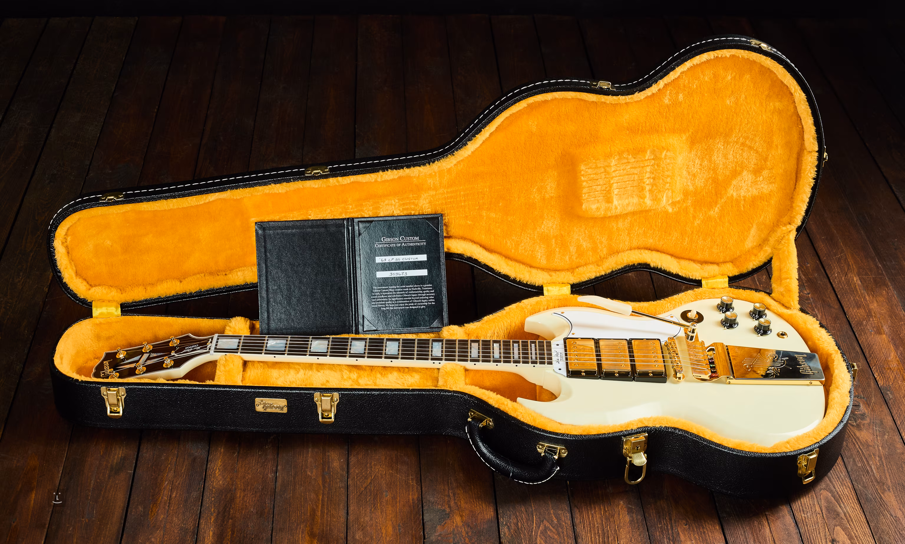 Arisztokratikus Gibson Custom Shop 1963 Les Paul SG Custom Reissue 3 hangszedővel és Maestro Vibrolával, VOS Classic White kivitelben – első tulajdonostól, kiváló formában. A gitár gyakorlatilag új, csak kipróbált, 2023-as Custom Shop gyártás.