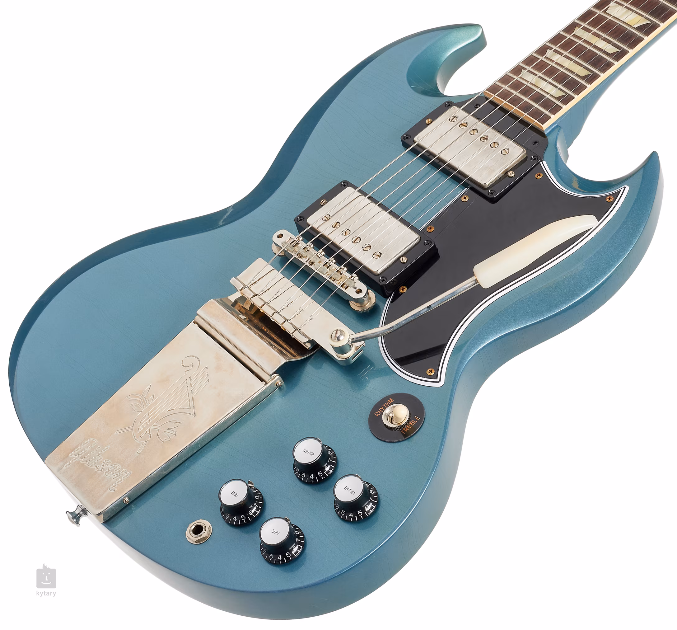 A CS 1964 SG Standard Reissue w/ Maestro Ultra Light Aged Pelham Blue a Gibson Custom Shop modellje a Murphy Lab kollekcióból, amely teljesen új gitárokat kínál a vintage eredetiek megjelenésével, érzésével és kézműves kivitelezésével.