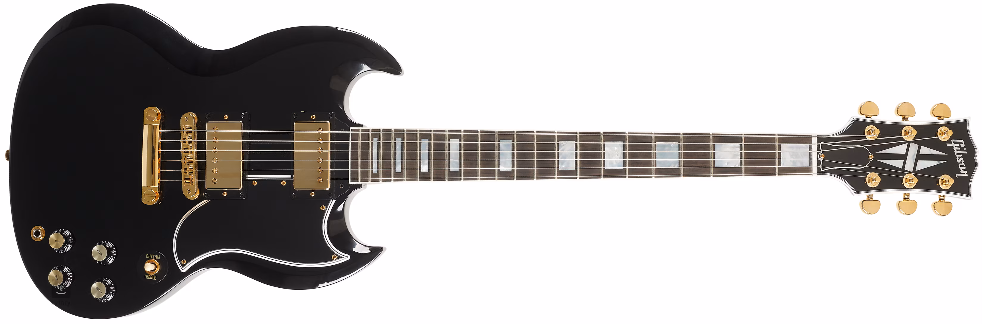 A Gibson SG elektromos gitárok méltán tartoznak a rockzene halhatatlan ikonjai közé. Olyan gitárlegendák neve fűződik a hangzásukhoz, mint Carlos Santana, Pete Townsend és más rockzenei nagyságok. Az SG Custom 2-Pickup w/ Ebony Fingerboard Gloss Ebony a Gibson Custom Shop egyik csúcsmodellje.