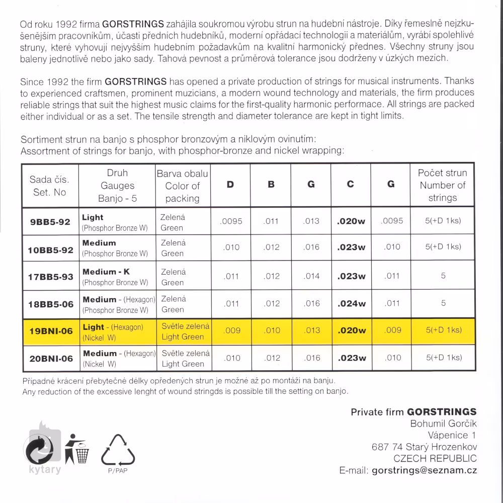 A cseh Gorstrings gyártó által gyártott húrok a cseh Gorstrings öthúros bendzsóhoz nagyon tiszta és specifikus hangzást, hosszú élettartamot és megbízható hangolási stabilitást biztosítanak. Hatszögletű acélmagjukat nikkelezett acéllal tekercselik, ami éles és csengő hangot biztosít, ideális a jellegzetes bendzsóhangzáshoz. Ha tábortűzre vagy country előadáshoz keres húrokat, ez a készlet lehet a megfelelő választás az Ön számára. A húrok prémium minőségű anyagokból készültek, és a legjobb cseh mesteremberek kezén mentek keresztül. Kényeztesse hangszerét a legjobbakkal a Gorstrings készletével!
