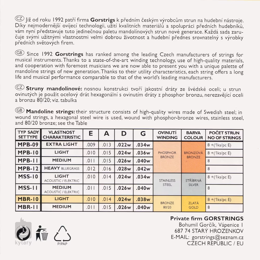 A Gorstrings cseh gyártó mandolinhúrjai első osztályú anyagokból készülnek, és a legjobb cseh mesteremberek keze alól kerültek ki. Alapjuk a prémium minőségű svéd acélból készült hatszögletű mag, amelyet a népszerű 80/20-as bronzötvözetbe burkolnak - ez tiszta, átható hangzást biztosít a húroknak, amely kihozza mandolinja valódi potenciálját. A húrokat hurokkal fejezik be a húrhorogra való felakasztáshoz. Adja hangszerének a legjobbat a Gorstrings húrjaival!
